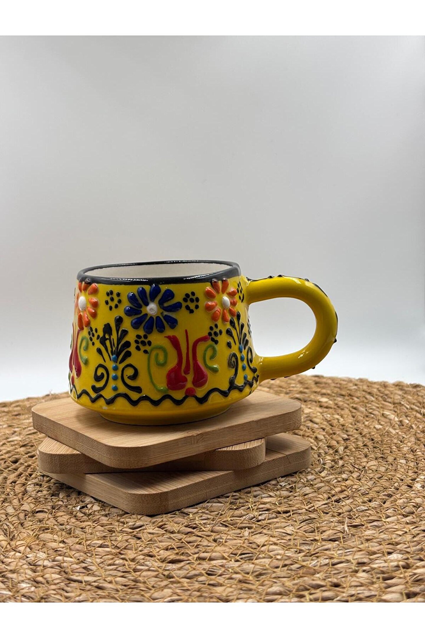 - El yapımı seramik malzemesiyle üretilmiş, benzersiz ve otantik bir tasarıma sahip.; - Kabartma desenleri ile zenginleştirilmiş yüzeyi, görsel olarak çekici bir görünüm sunar.; - 250 ml kapasitesi sayesinde içeceklerinizi keyifle tüketebilirsiniz.; - Menşei Türkiye'den gelen bu kupa, yerel el sanatlarının özgün bir temsilcisidir.