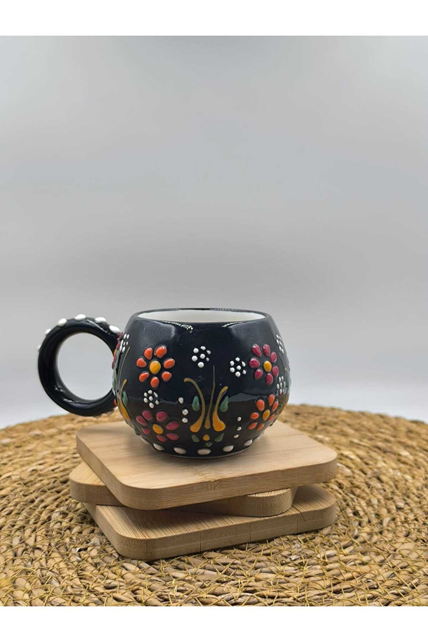 - El yapımı seramik malzemesiyle üretilmiş, benzersiz ve otantik bir tasarıma sahip.; - Kabartma desenleri ile zenginleştirilmiş yüzeyi, görsel olarak çekici bir görünüm sunar.; - 250 ml kapasitesi sayesinde içeceklerinizi keyifle tüketebilirsiniz.; - Menşei Türkiye'den gelen bu kupa, yerel el sanatlarının özgün bir temsilcisidir.