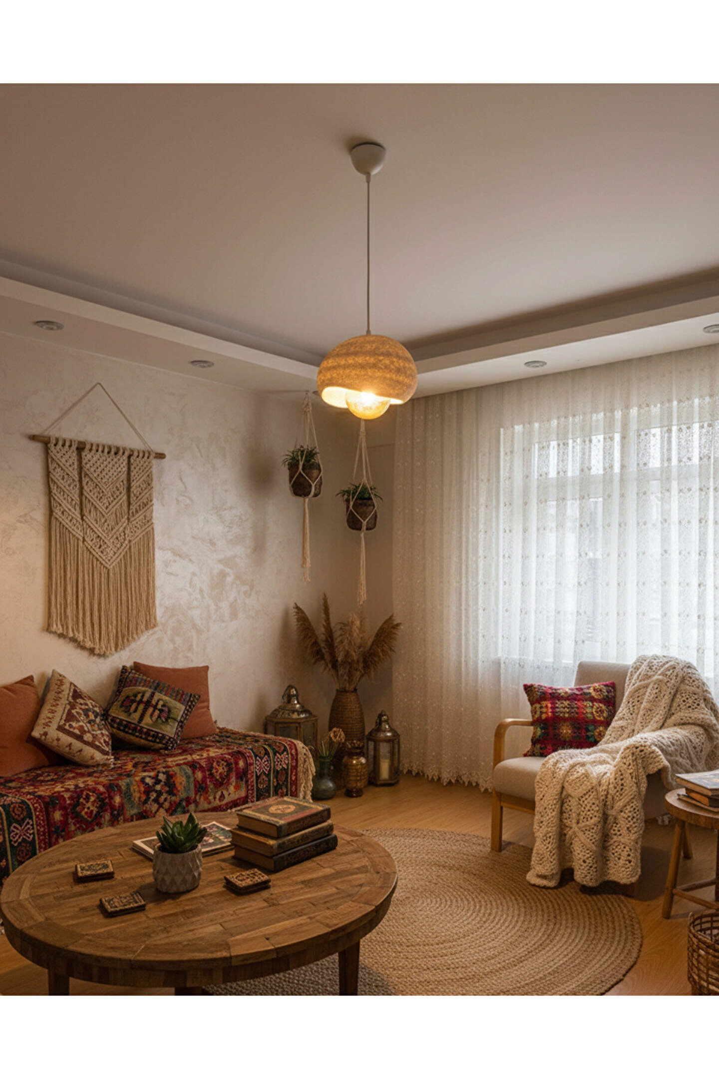 - Modern ve bohem tarzı bir görünüm sunan bu avize, salon ve oturma odası gibi alanlarınızda şıklığı ve konforu bir arada yaşatır.; - Oval tasarımı ile mekanınıza zarif bir dokunuş katar ve göz alıcı bir atmosfer yaratır.; - Plastik materyali sayesinde hafif ve dayanıklı bir yapıya sahip olup, kolayca monte edilebilir.; - Tekli sarkıt yapısı, tek bir ampul ile aydınlatma ihtiyacınızı karşılar ve enerji tasarrufu sağlar.; - TR menşeli olmasıyla yerli üretim kalitesini evinize taşır; güvenilir ve uzun ömürlü kullanım sunar.; - E27 duy tipi, geniş ampul seçenekleriyle uyumlu olup, istediğiniz aydınlatma yoğunluğunu kolayca ayarlamanızı sağlar.; - 65- 20cm arasında ayarlanabilir yükseklik özelliği ile mekanınıza en uygun yüksekliği seçme esnekliği sunar.