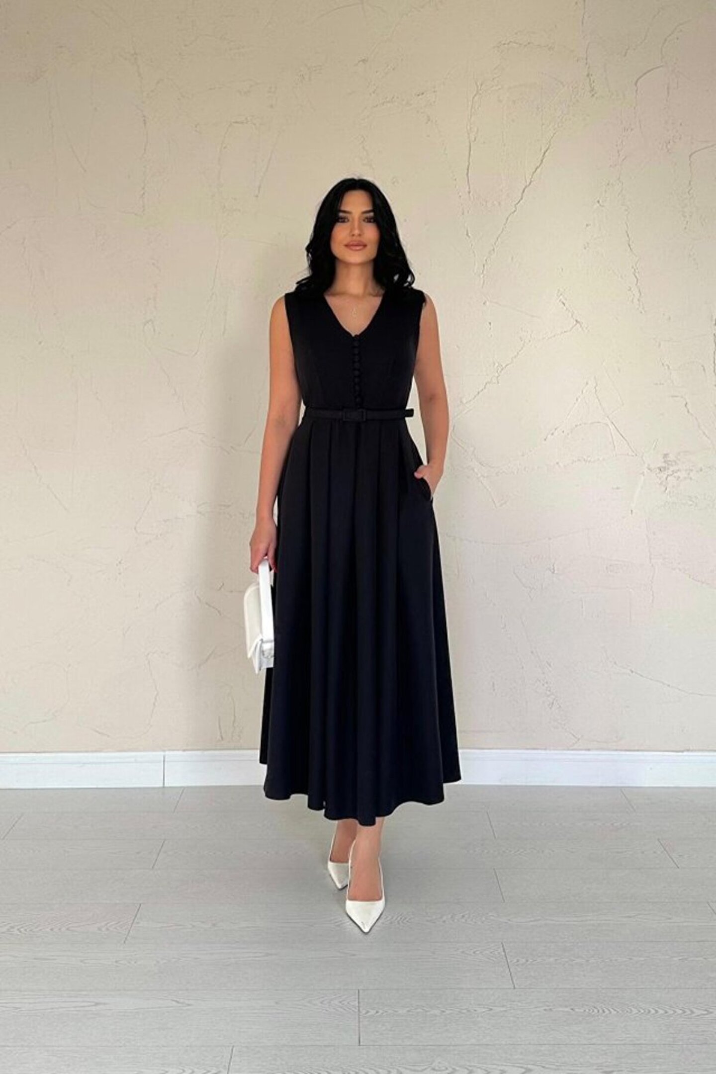 Adora Moda Siyah Önü Britli Pileli Elbise