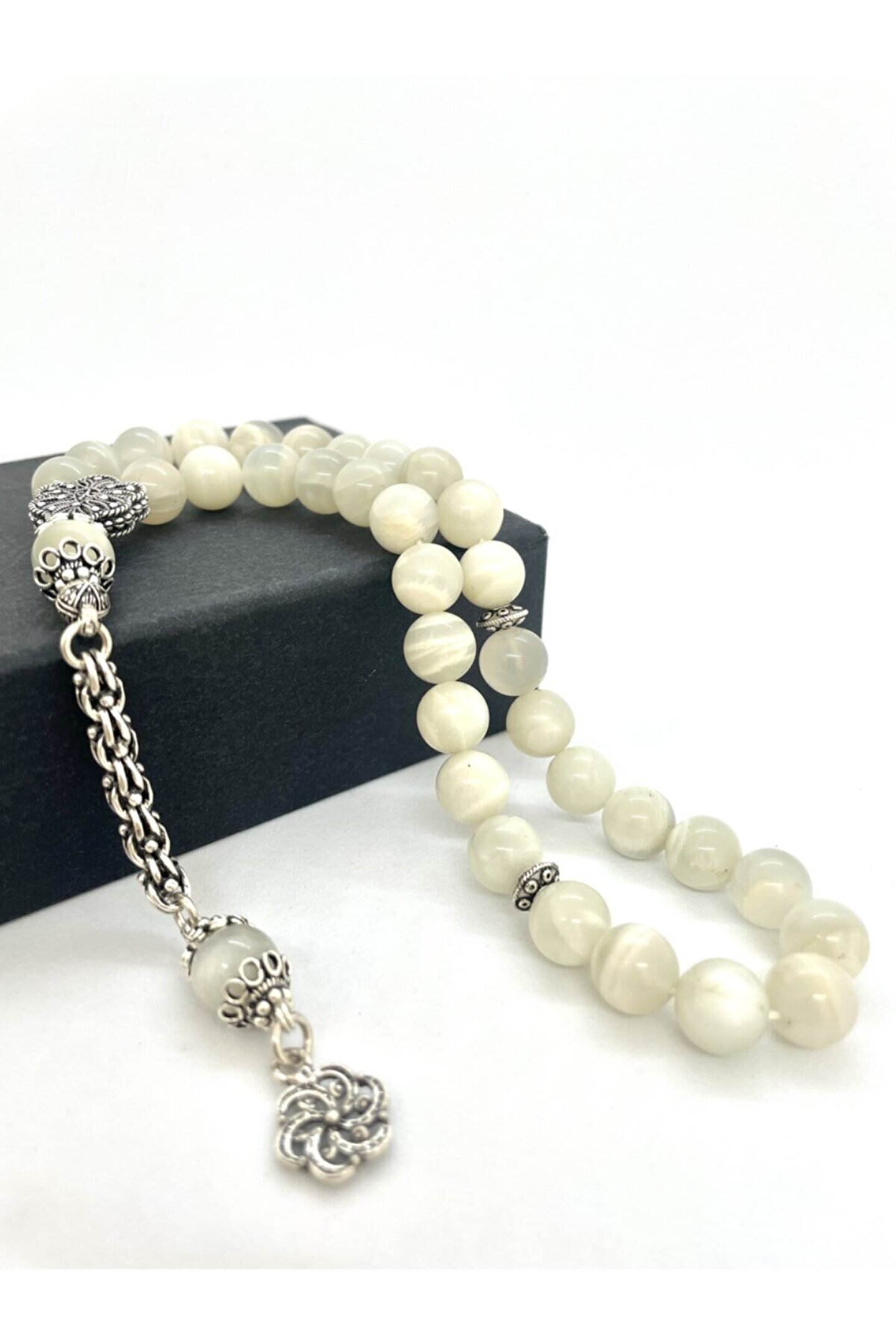 Gümüş kaplama malzemesiyle üretilmiş, uzun ömürlü ve şık bir görünüm sunar; Doğal aytaşı taşı, her bir tesbih tanesi benzersiz desen ve renklerle süslenmiştir, bu da her kullanımda farklı bir deneyim sağlar; Geleneksel el işçiliği ile üretilmiş olup, hem estetik hem de kalite açısından öne çıkar;