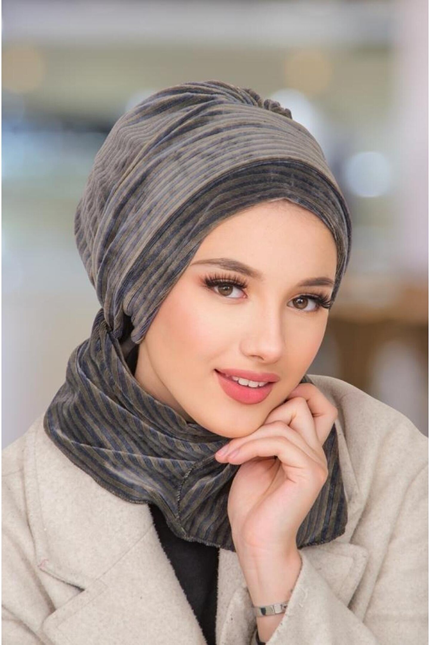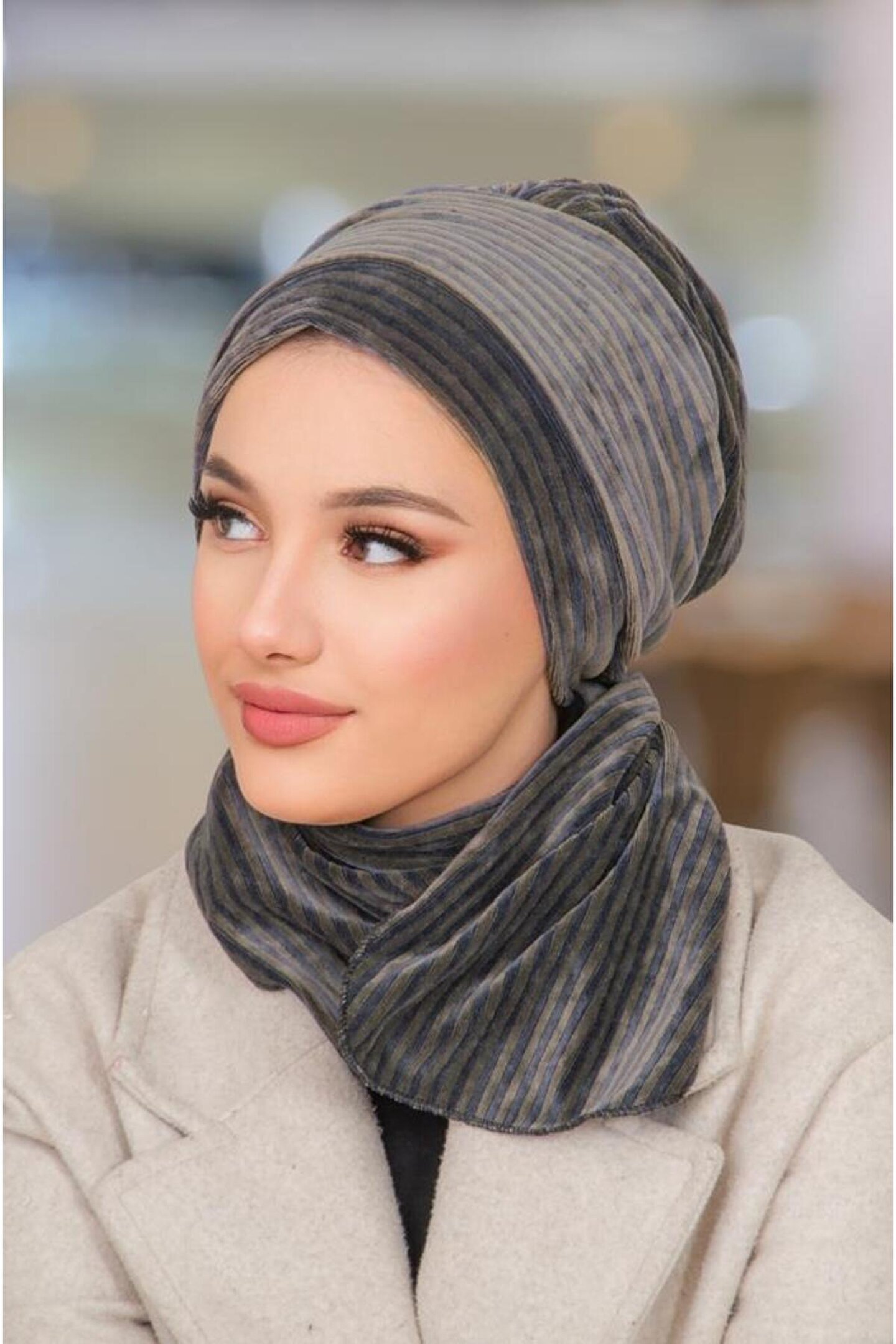 Aişe tesettür Antrasit Çizgili Kadife Atkılı Tesettür Bone