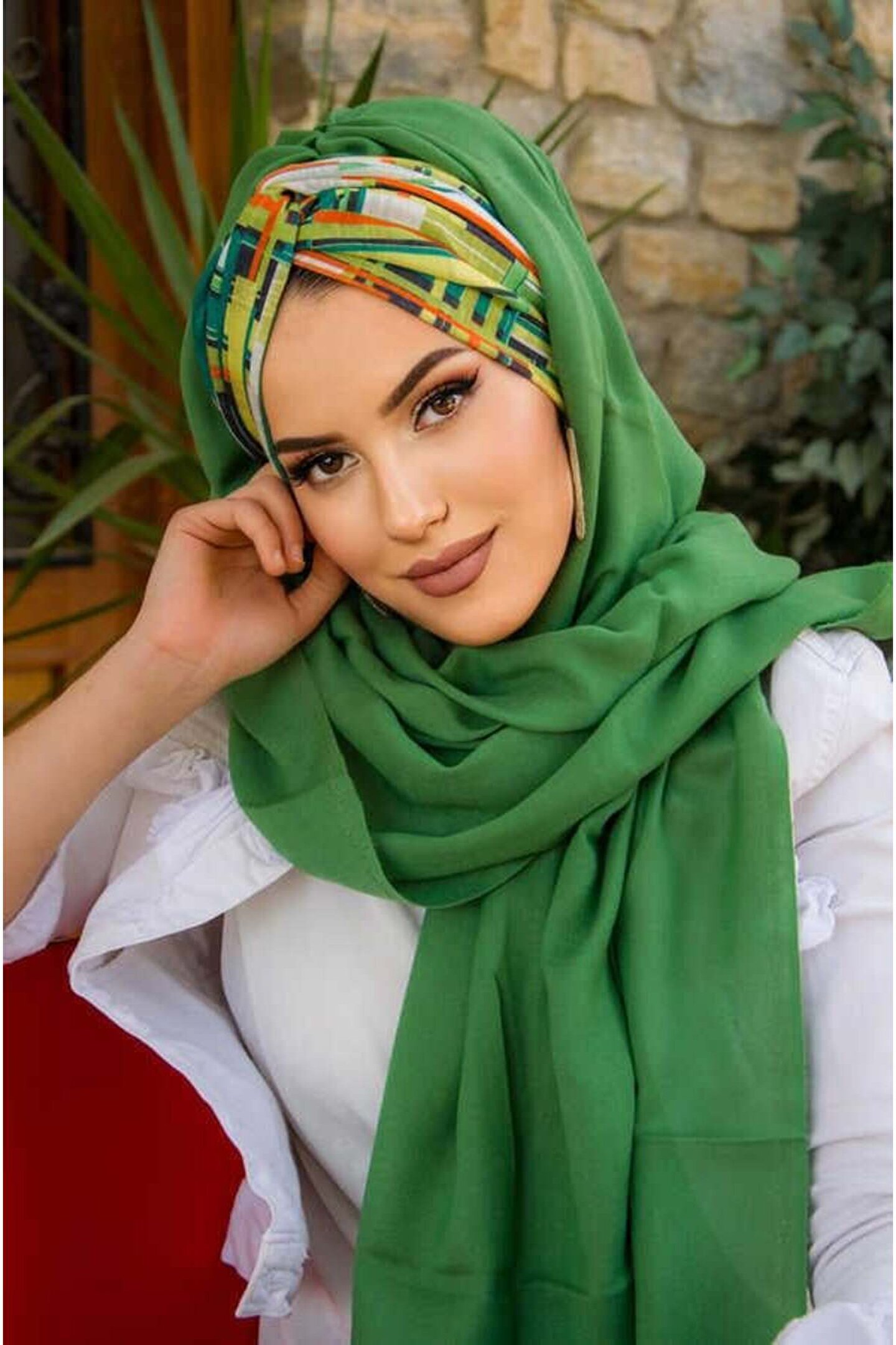 Aişe tesettür Bahar Yeşili Geometrik Desen Burgu Hazır Şal