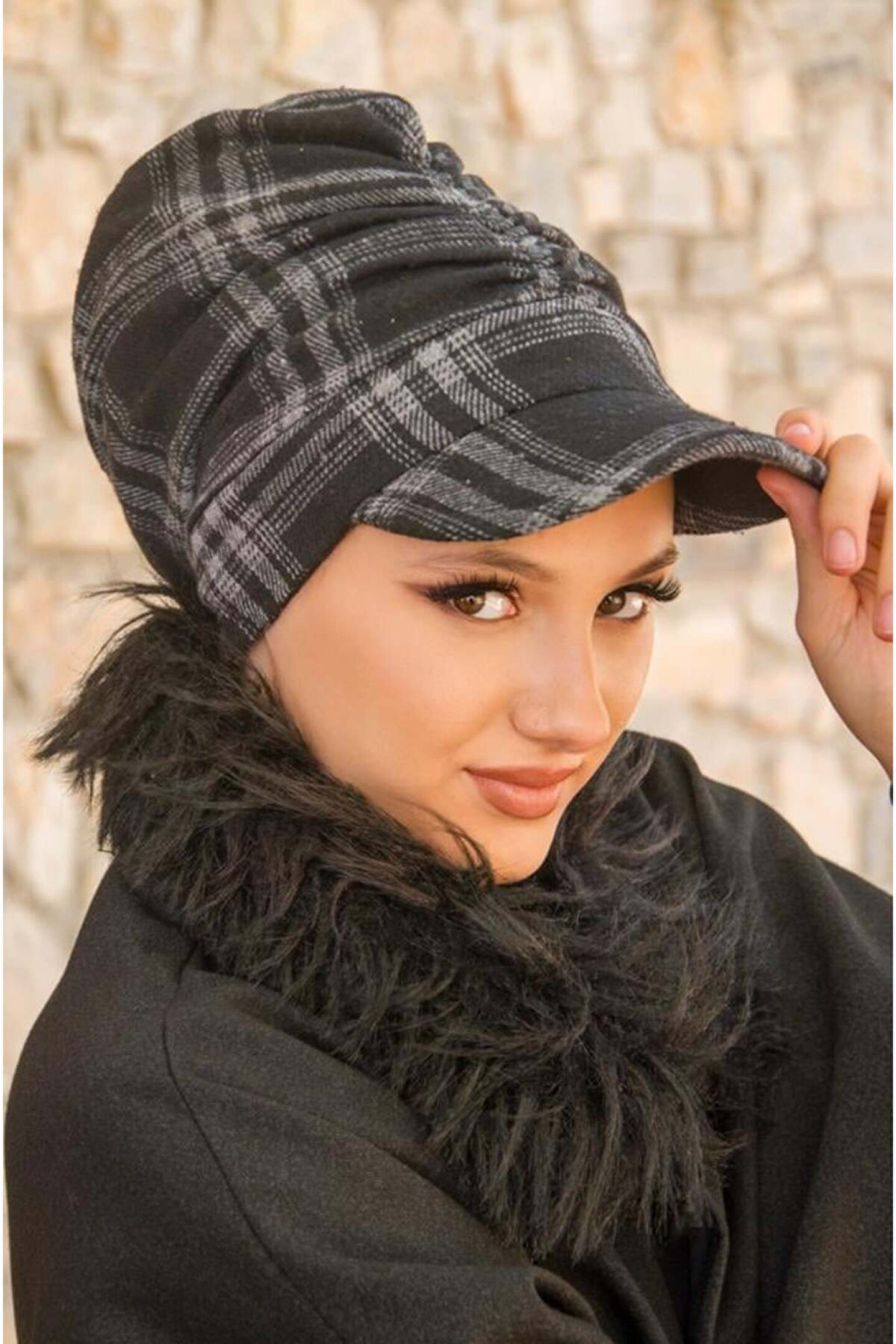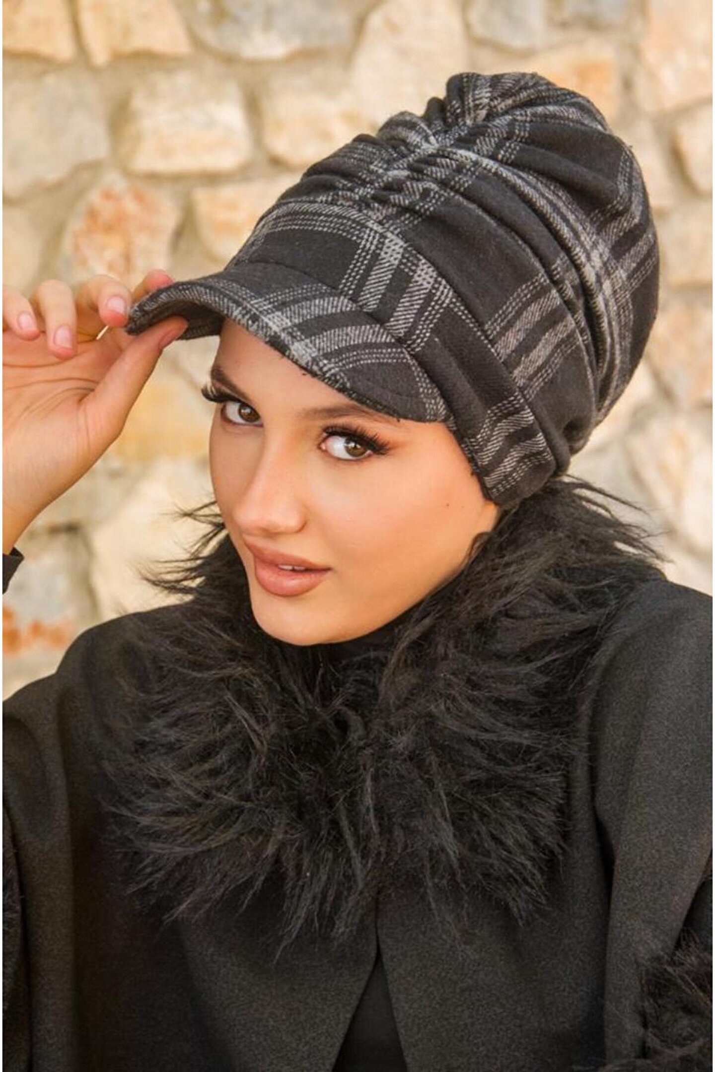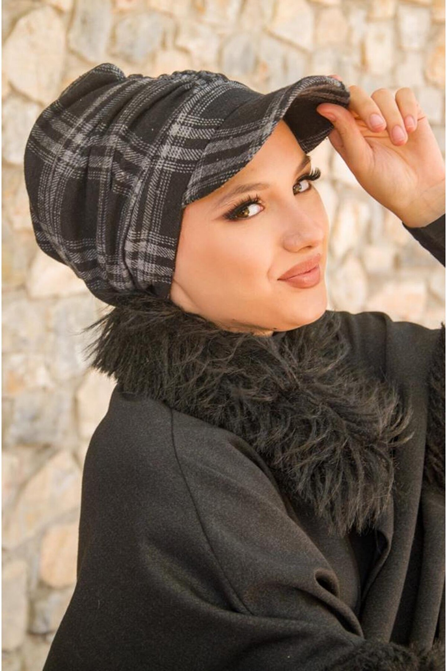 Aişe tesettür Füme Siyah Ekose Desen Tesettür Şapka