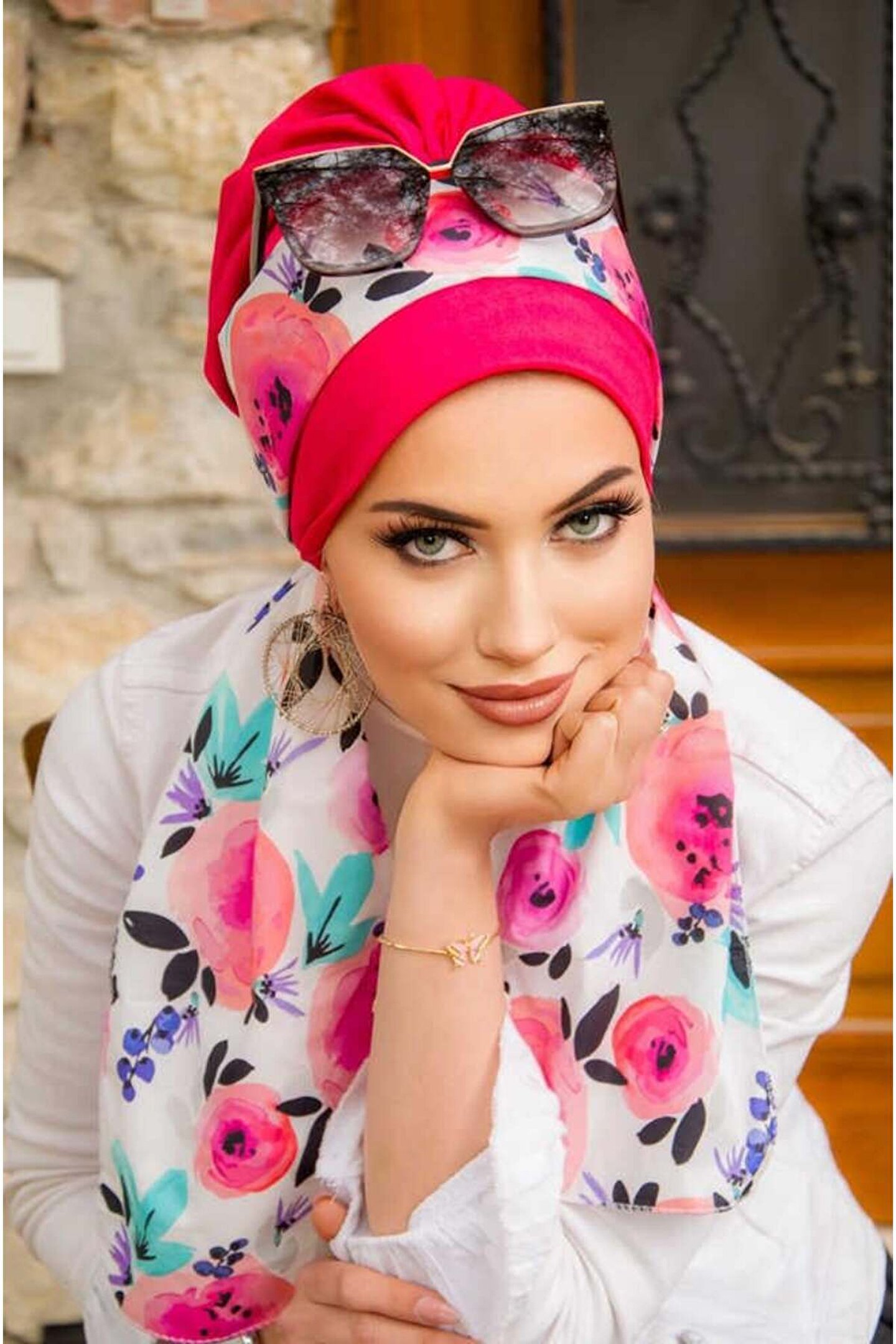 Aişe tesettür Fuşya Çiçek Desen Fularlı Bone