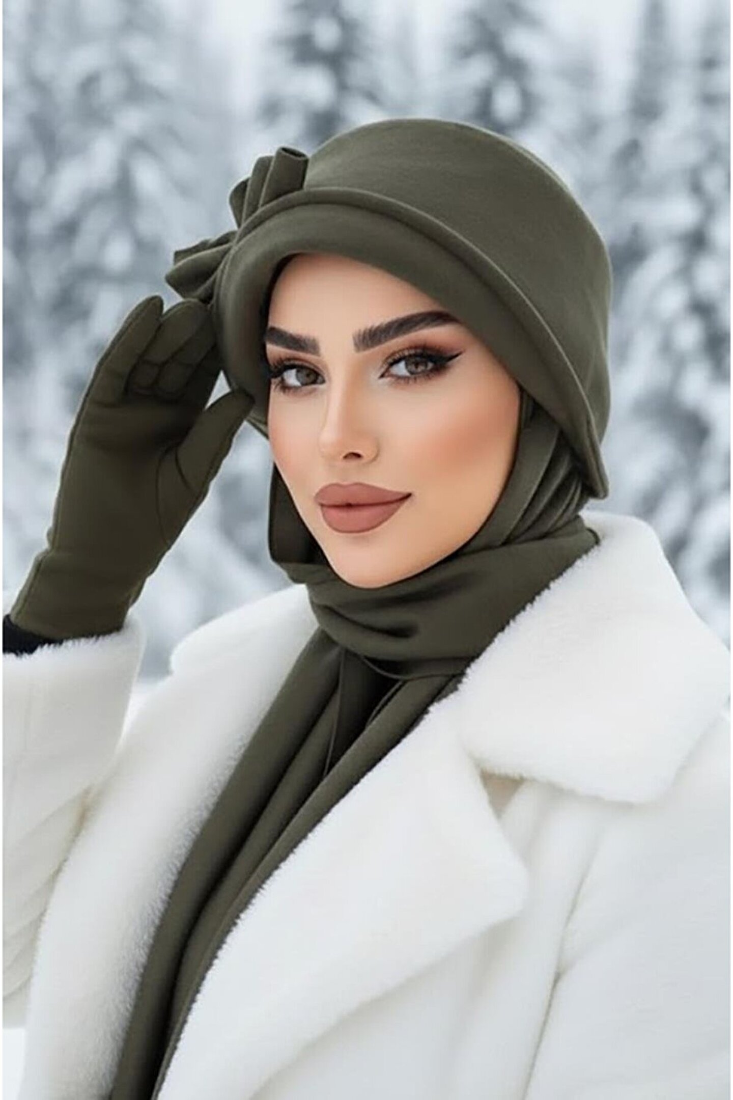 Aişe tesettür Haki Aksesuarlı Atkılı Vintage Şapka