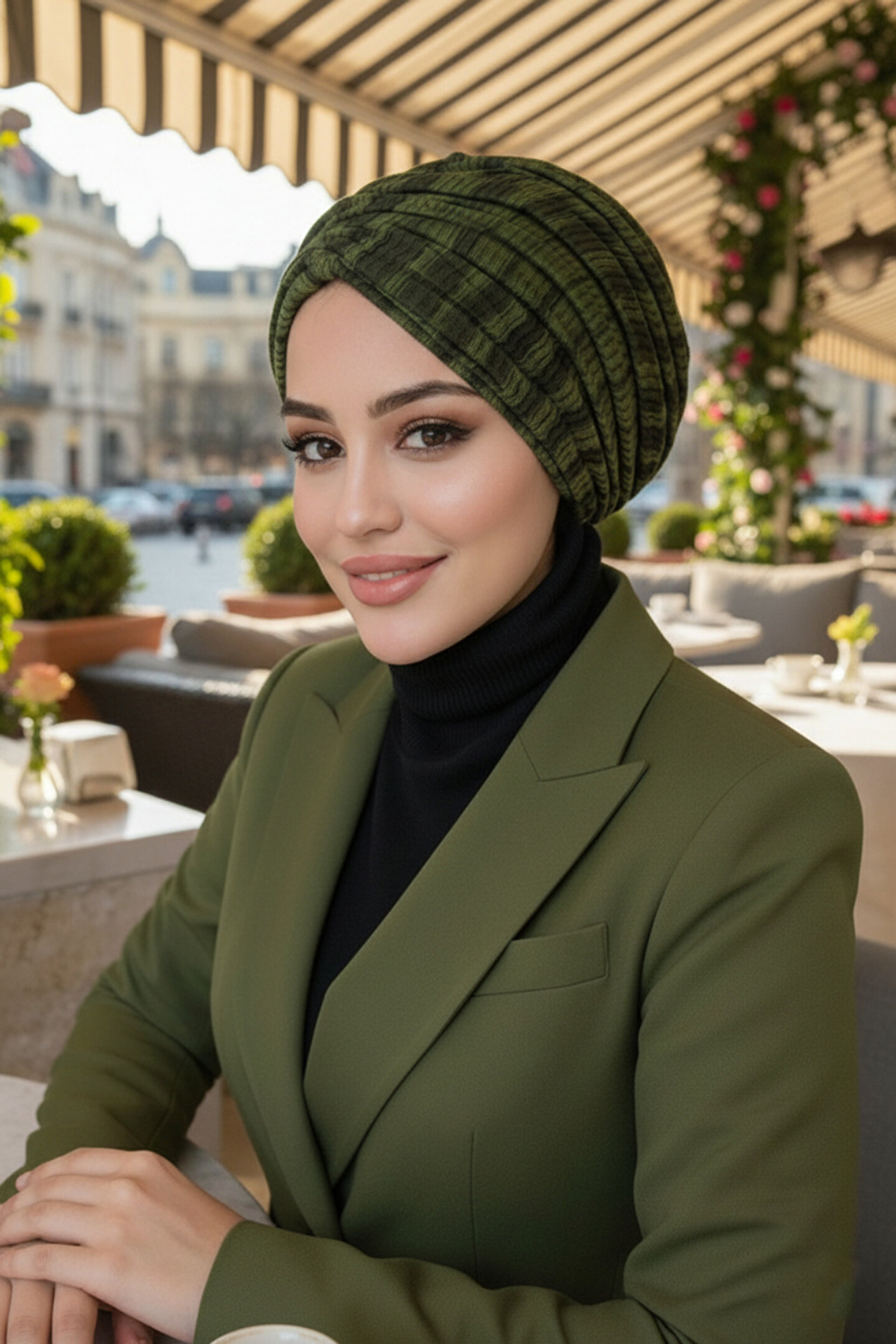 Aişe tesettür Haki Siyah Desen Büzgülü Salaş Bone