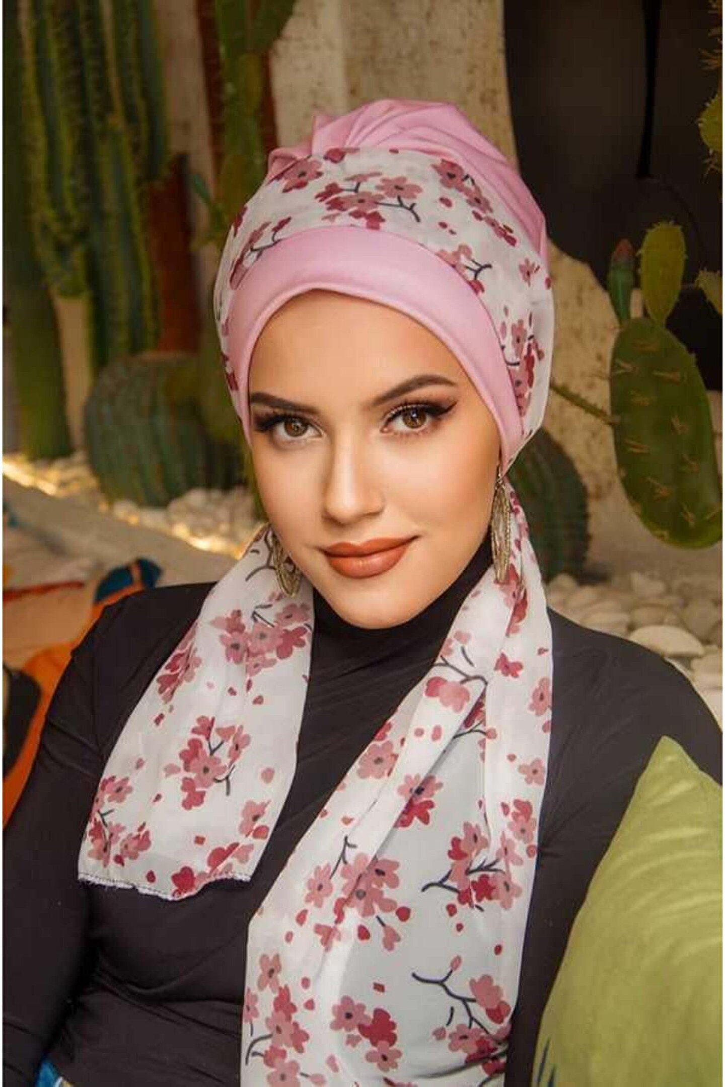 Aişe tesettür Pudra Çiçek Desen Fularlı Bone