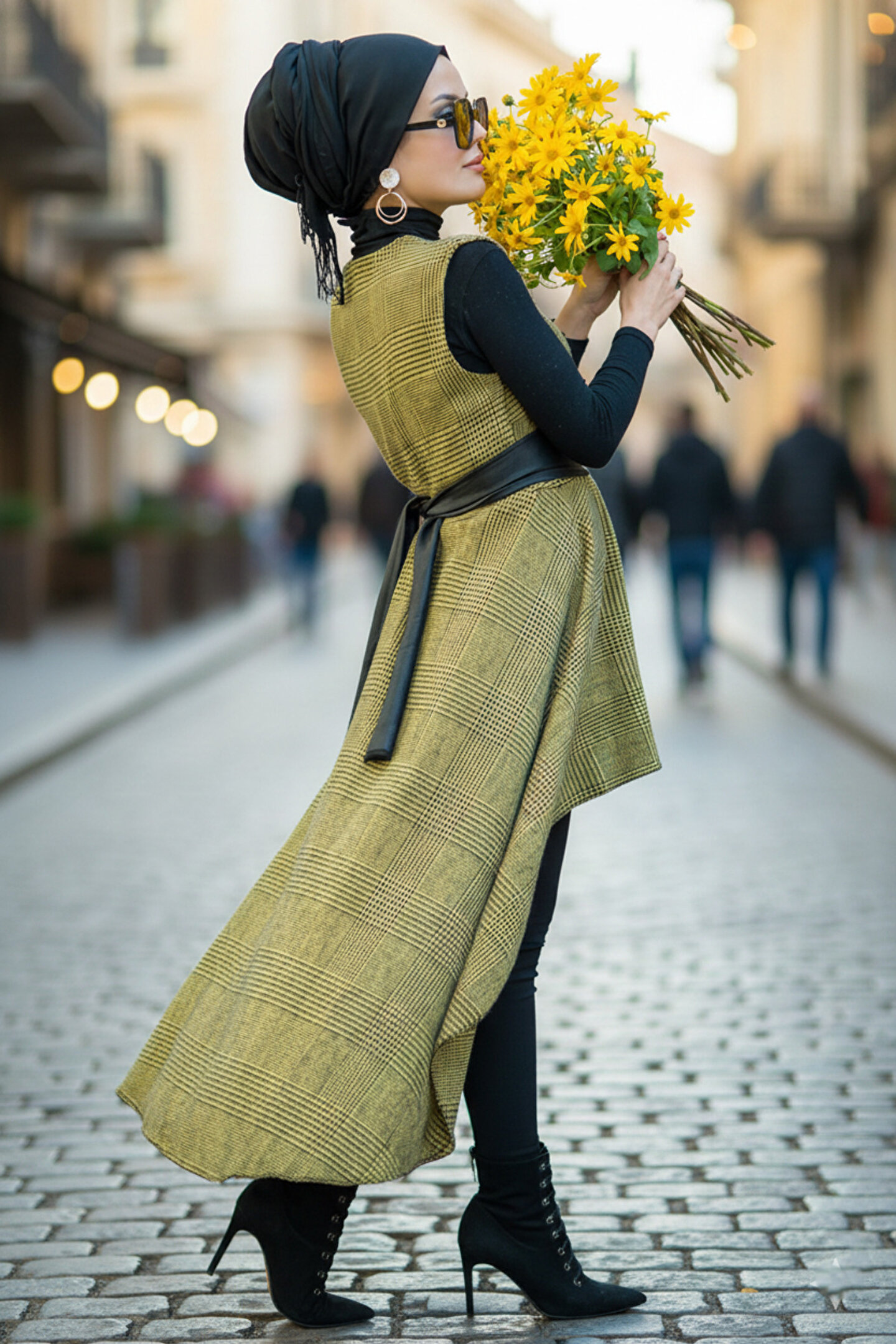 Aişe tesettür Sarı Siyah Kareli Yelek