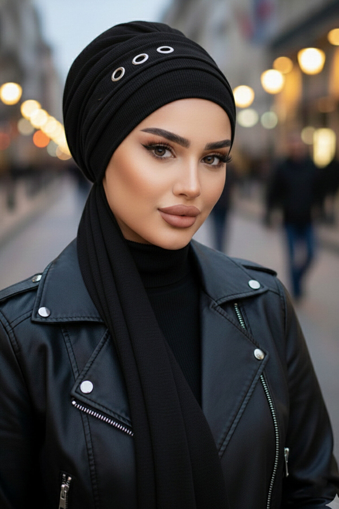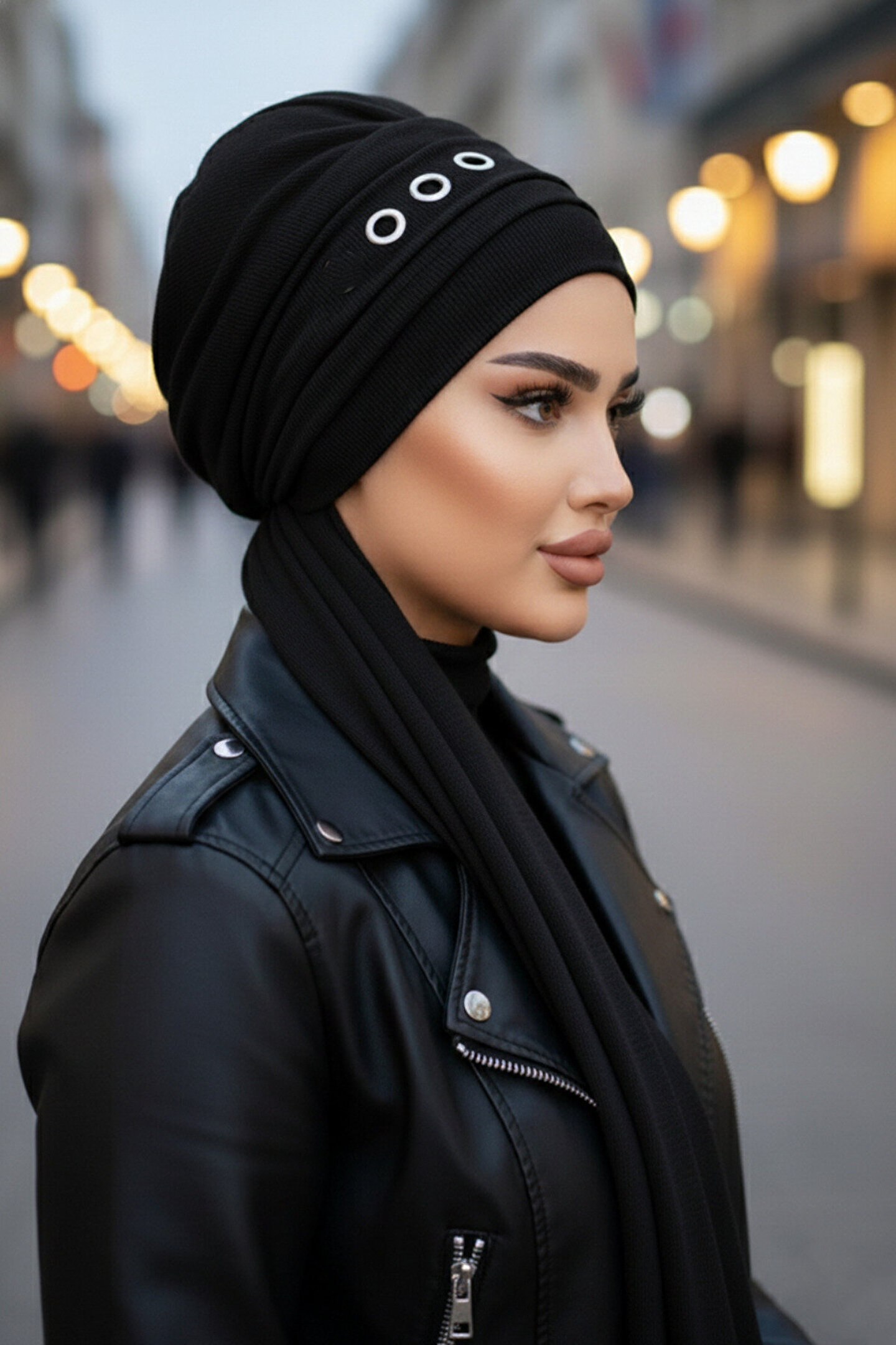 Aişe tesettür Siyah Metal Detaylı Atkılı Bone