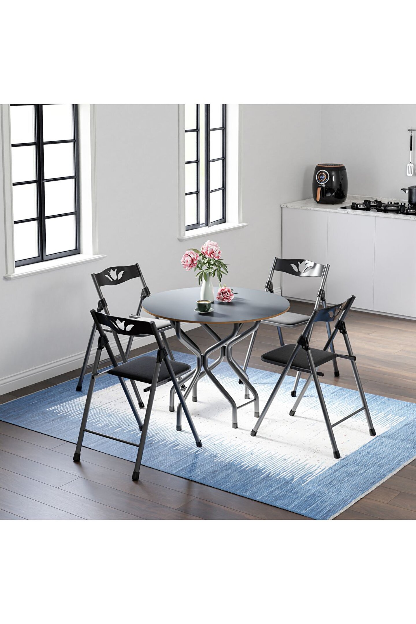 Birinci Kalite %100 Türk Malı; Highglos MDF; Malzeme; 1 Adet 90x90 Masa; 4 Adet Sandalye; Masa Yan Kanatları Katlanır Özelliktedir.; Dar Alanlarda Masanın Bir Kanadı Katlayarakda Kullanabilirsiniz.; Isterseniz 2 kanadınıda katlayabilirsiniz.; Ayrıca tüm sandalyelerde katlanabilir özelliğe sahip olup kullandıktan sonra katlayarak masanın ortasındaki boşluğa yerleştirebilirsiniz.; Sandalyeler, Mutfak Balkon Salon Gibi iç Mekanlarda Kullanılmak İçin Tasarlanmış Olup Şık Görünümü Sayesinde Bulunduğu Ortama Ayrı Bir Güzellik Katacaktır.; Sandalyelerin Sırt ve Mafsalları Plastik Ozellikte Olup Estetiktir.; Sandalyelerin Oturum yerleri Suni deriden imal edilmiştir Yenilenmiş Gövde Demir Aksamı En Az 1 ml. Kalınlıktadır.; Gövde Gri renkli Fırın Boya ile Boyanmıştır.; Ürünün Açık Ölçüleri: 90x90 cm genişlik, 70 cm yükseklik.; Ürünün Kapalı Ölçüleri:39 cm Genişlik, 90 cm Uzunluk, 70 cm Yükseklik.; Ürün Demonte Olarak Gönderim Yapılacaktır.;