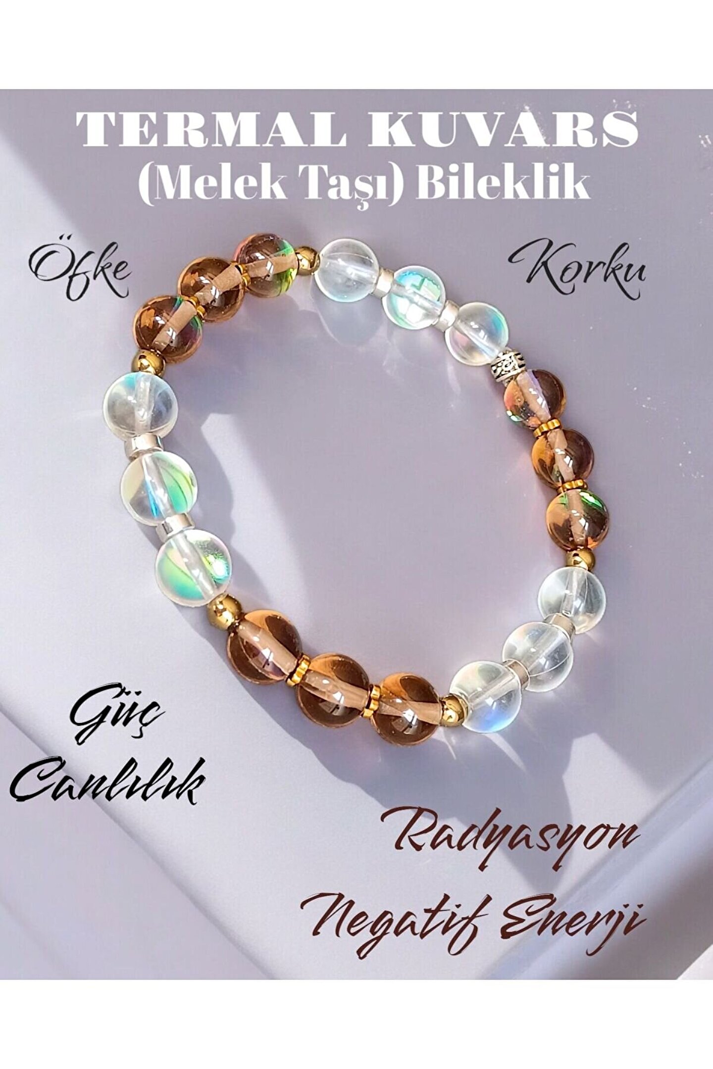 Doğal taş termal kuvars bileklik, doğanın güzelliğini bileğinize taşır. Bu bileklik, her zaman şık ve doğal bir görünüm sunar.; Doğal taş kullanımı sayesinde her biri benzersiz ve özgün bir tasarıma sahiptir. Bu bileklik, kişisel tarzınızı yansıtırken doğanın enerjisini de yanınızda taşımanızı sağlar.; Termal kuvars, negatif iyonları nötralize ederek stresi azaltmaya yardımcı olur. Bu sayede gün boyu kendinizi daha sakin hissedersiniz.; Bijuteri takım olarak tasarlanan bu bileklik, gündelik kullanımdan özel davetlere kadar her ortamda rahatlıkla tercih edilebilir. Şık tasarımıyla dikkat çekerken doğal dokusuyla da fark yaratır.; Doğal taş termal kuvars bileklik, uzun ömürlü kullanımı sayesinde yatırımınızın karşılığını almanızı sağlar. Her kullanımda doğanın enerjisini yanınızda hissetmek istiyorsanız bu bileklik tam size göre!;