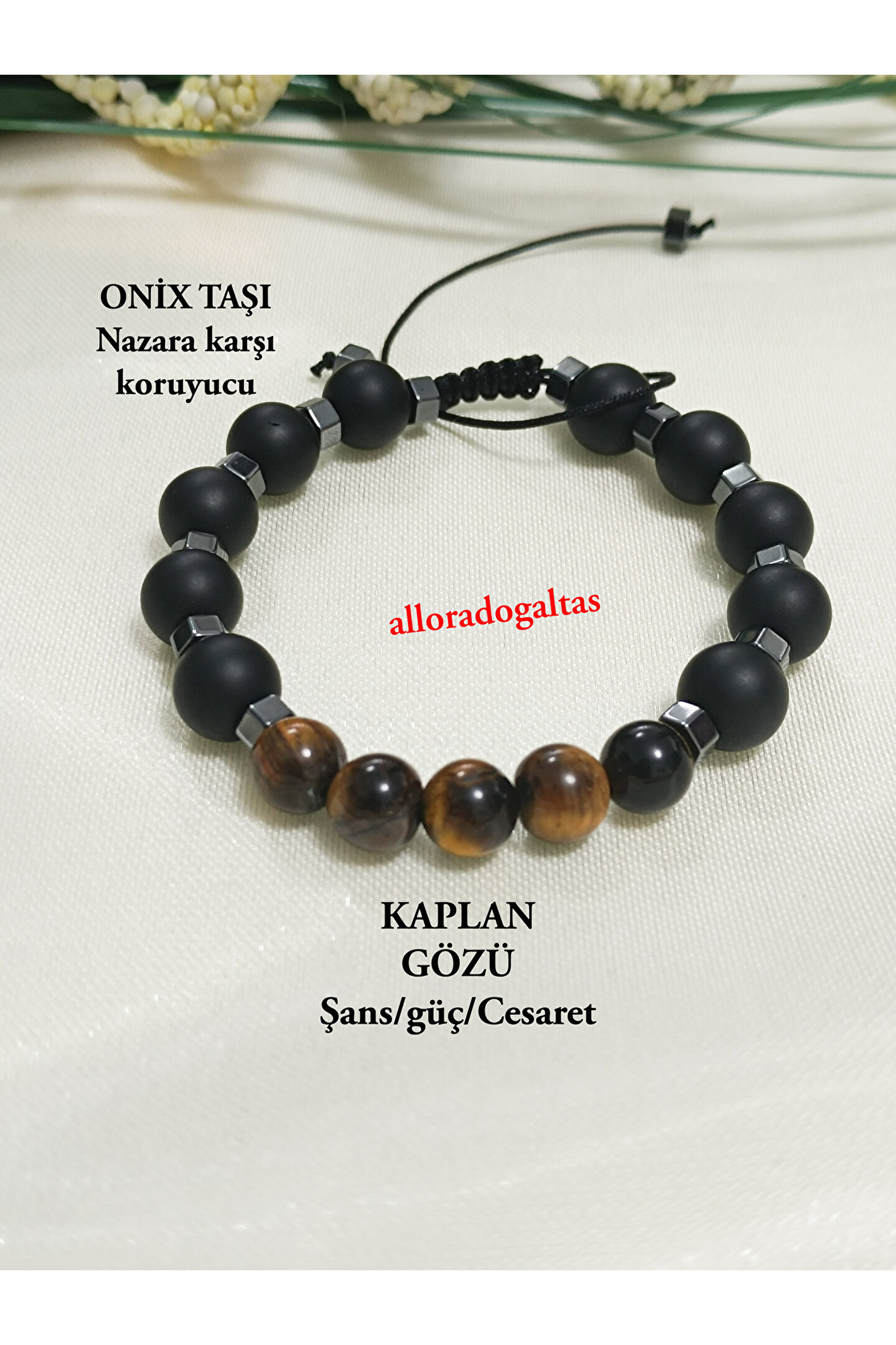 Doğal taş kullanımı ile tasarlanmış, Kaplan gözü mat&onix taşı bileklik, doğallığı ve şıklığı bir arada sunar.; El yapımı bilezik, benzersiz ve özel tasarımıyla dikkat çeker.; Kaplan gözü taşı, pozitif enerjiyi temsil eder ve kişisel bakım ritüellerinde kullanılırken aynı zamanda şık bir aksesuar olarak da tercih edilir.; Onix taşı ise toprak elementini simgeleyerek, sakinleştirici ve dengeleyici etkileriyle bilinir.; Bijuteri bileklik, günlük kullanıma uygun rahatlıkta olup, farklı kıyafetlerle kolayca kombinlenebilir.; Doğal taşların benzersiz yapısı sayesinde her bilezik kendine özgü karakteristik özellikleri taşır.; Özel günlerde hediye olarak da tercih edilebilecek bu bileklik, sevdiklerinize değer verdiğinizi hissettirecek anlamlı bir hediye alternatifi sunar.;