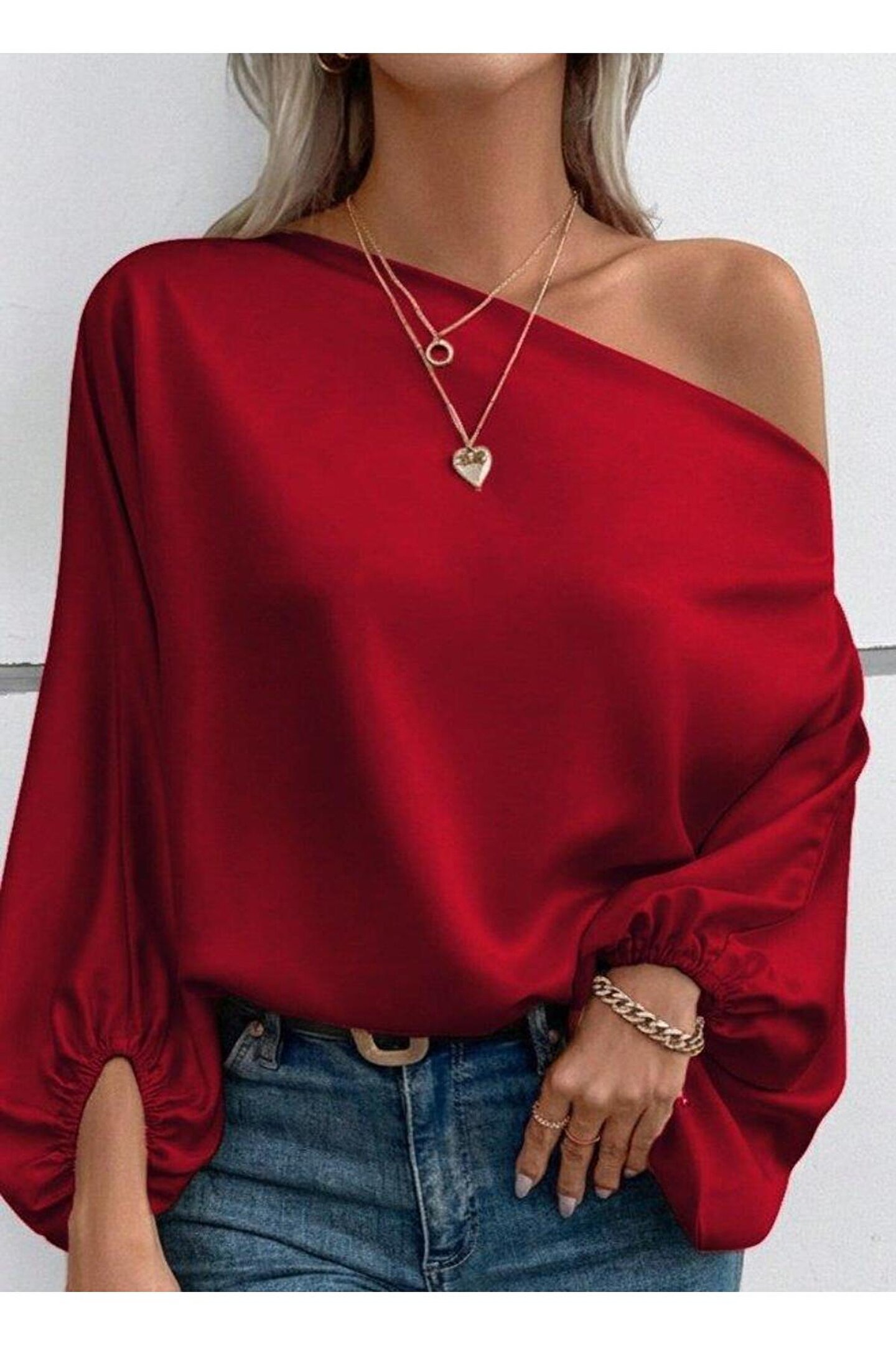Kadın Tek Omuzu Açık Uzun Kollu Salaş Sandy Bluz