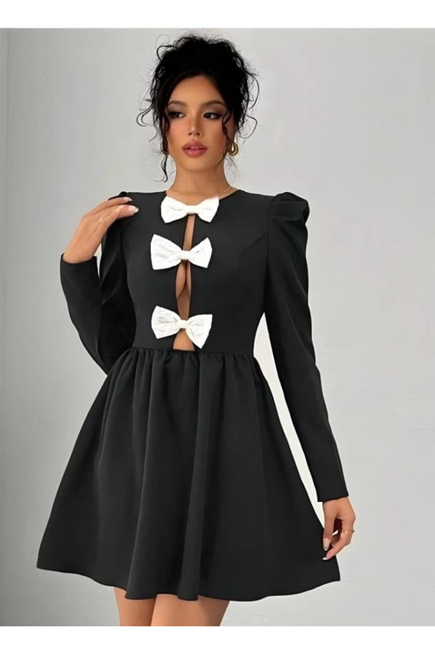 Kadın Dalgıç Kumaş Fiyonk Detaylı Uzun Kollu Mini Boy Elbise