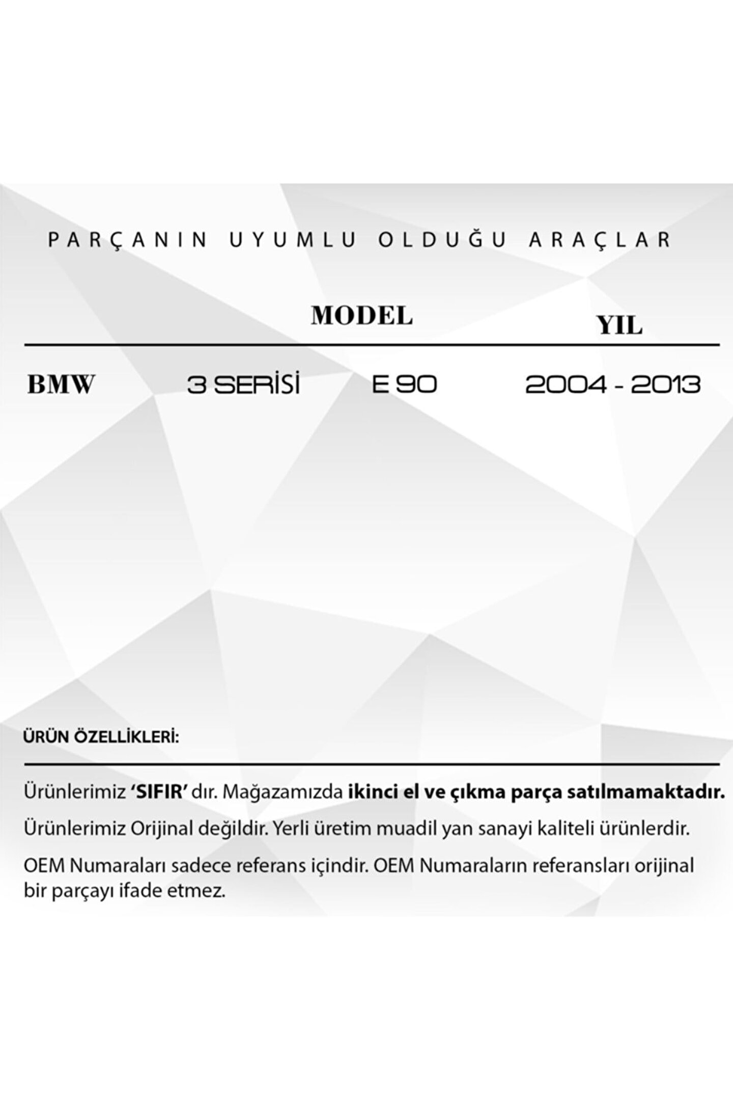 BMW 3 Serisi E90 için Kapı Kilit Tamir Takımı.; Araba Kapı Kilit Tamir Takımı, aracınızın kapı kilitlerini kolayca ve hızlıca tamir etmenizi sağlar.; Bu tamir takımı, profesyonel kalitede malzemelerden üretilmiştir ve uzun ömürlü sunar.; Yüksek dayanıklılığa sahip bu takım, sert koşullarda bile mükemmel bir iş çıkarır.; Araba Kapı Kilit Tamir Takımı, kullanımı kolaydır ve her türlü araba kapı kilidiyle uyumludur.; Bu takım, kendin yap projeleri için idealdir ve işe yeni başlayanlar için bile uygun bir seçenektir.; Araba Kapı Kilit Tamir Takımı ile zamandan tasarruf edin ve aracınızın kapı kilidini kendiniz tamir edin.; Ürün Kodu: DLR2255