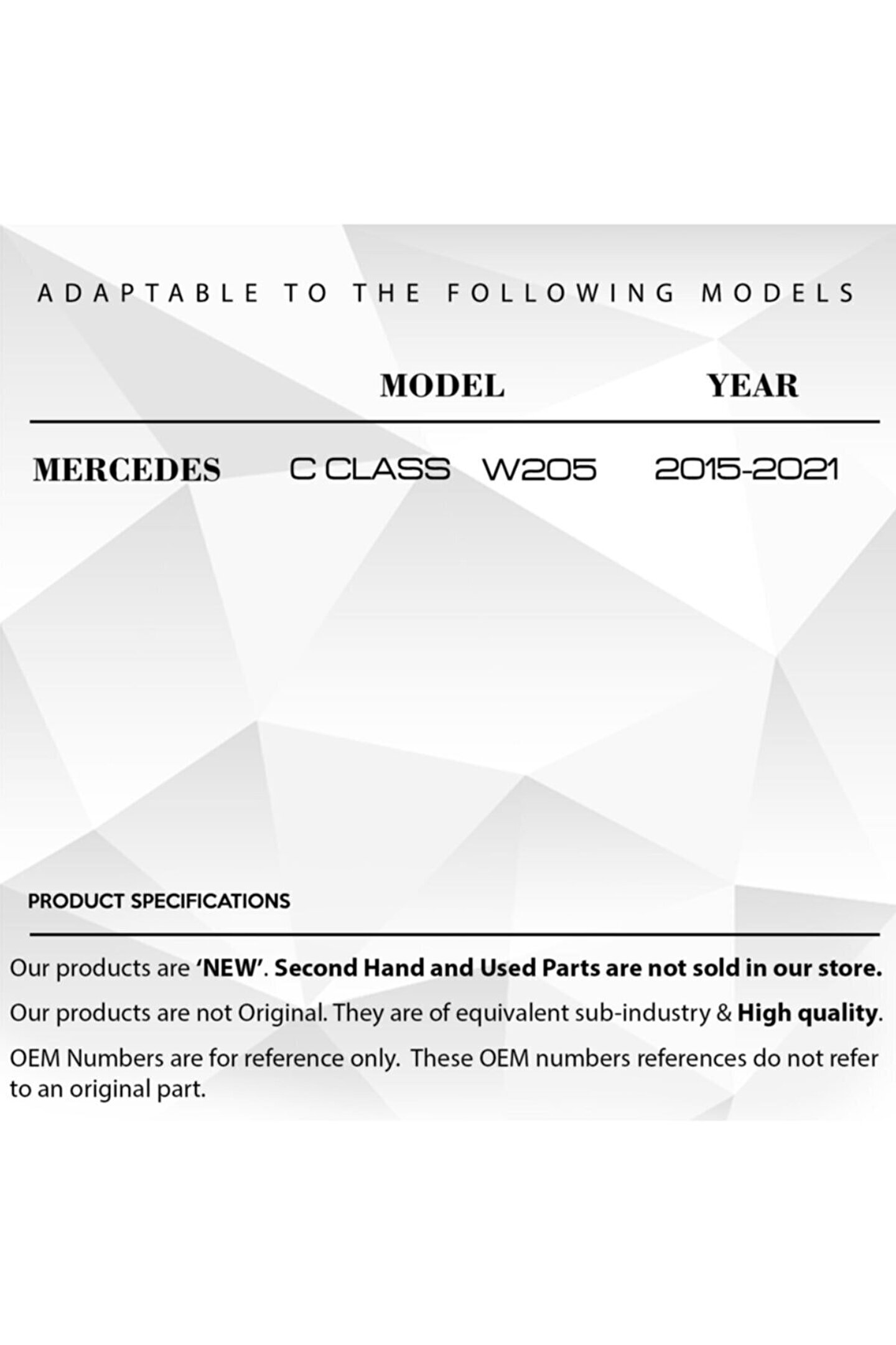 Bu parça aşağıda yer alan araçlar ile uyumludur; Mercedes C 180 7G-TRONIC PLUS; Mercedes C 200; Mercedes C 200 7G-TRONIC PLUS; Mercedes C 250; Mercedes C 300; Mercedes C 300 4MATIC; Mercedes C 350 PLUG-IN HYBRID; Mercedes C 400 4MATIC; Mercedes C 450 AMG 4MATIC; Mercedes AMG C 43 4MATIC; Mercedes AMG C 63; Mercedes AMG C 63 S; Mercedes C 220 BlueTEC; Mercedes C 220 BlueTEC 7G-TRONIC PLUS; Mercedes C 250 BlueTEC; Mercedes C 300 BlueTEC HYBRID;
