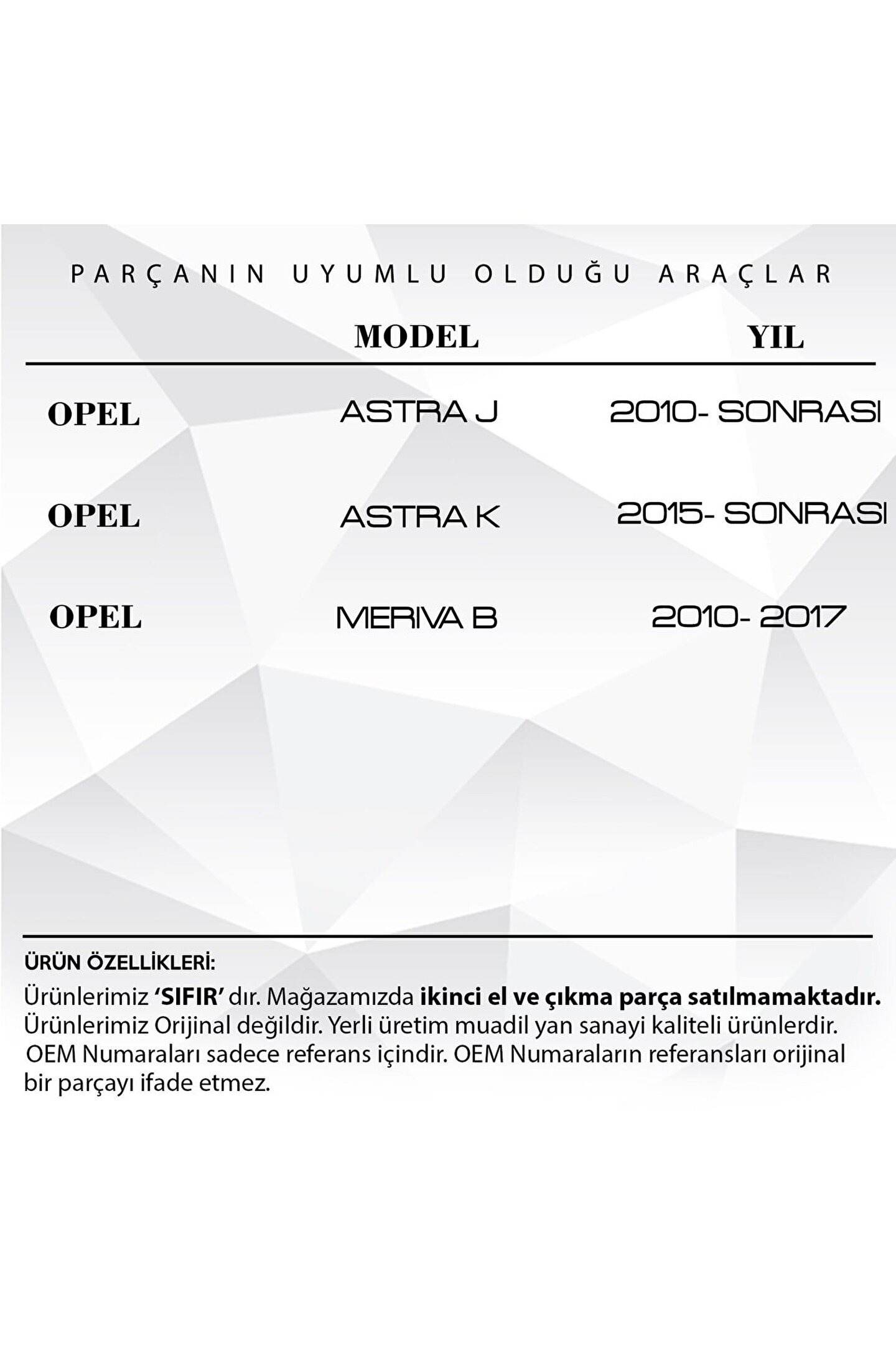 Opel Astra J.; Astra K.; Meriva B İçin Ön Silecek Kapağı.; Araba Ön Silecek Kapağı (Ürün Kodu: WG2220) ile aracınızın sileceklerini dış etkenlerden koruyun.; Bu kapak, dayanıklı yapısı ve en iyi malzemeden üretilmiş olmasıyla uzun ömürlü ve sağlam bir kullanım sunar.; Aşınma ve yıpranmaya karşı ekstra koruma sağlar, böylece silecekleriniz daha uzun süre etkin bir şekilde çalışır.; Kolay montajı sayesinde, herhangi bir alet kullanmadan hızlı ve kolay bir şekilde takılabilir.; Aracınızın estetiğine zarar vermeden, sileceklerinizi koruma altına alır.; Araba Ön Silecek Kapağı, arabanızın ömrünü uzatırken aynı zamanda görünümünü de korur.; Bu, sileceklerinizi her türlü hava koşulunda koruyarak performanslarını artırır.; Üst düzey bir koruma sağlayan bu kapağı kullanarak, sileceklerinizin verimliliğini ve ömrünü artırabilirsiniz.
