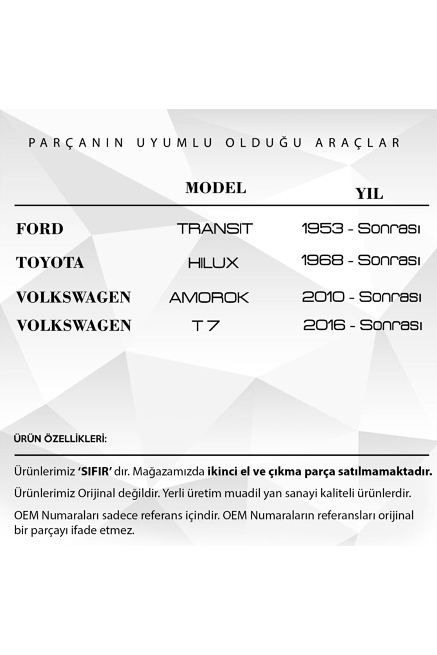 Transit.; Toyota Hilux.; VW Amorok.; T7 için Elektrikli Ayna Dişlisi.; Araba Elektrikli Ayna Dişlisi (Ürün Kodu: MR2233), aracınızın yan aynalarının hızlı ve sorunsuz bir şekilde hareket etmesini sağlar.; Bu dişli, araç sürüş deneyiminizi artırmak için tasarlanmıştır ve son derece dayanıklıdır.; Elektrikli ayna dişlisi, hassas ve sorunsuz hareket için yüksek özellikli malzemelerden üretilmiştir.; Hızlı ve kolay montajı ile öne çıkar ve orijinal ekipman kalitesine uygun bir performans sunar.; Bu ürün, aynalarınızın her seferinde doğru konumda olmasını sağlar, böylece güvenliğinizi artırır.; MR2233 modeli, sürüş deneyiminizi en üst seviyeye çıkaracak bir yedek parça seçeneğidir.; Bu ürün, uzun ömürlü ve güvenilir bir performans için dayanıklı ve sağlamdır.; Araba Elektrikli Ayna Dişlisi, aracınızın aynalarının optimum performansını sürd
