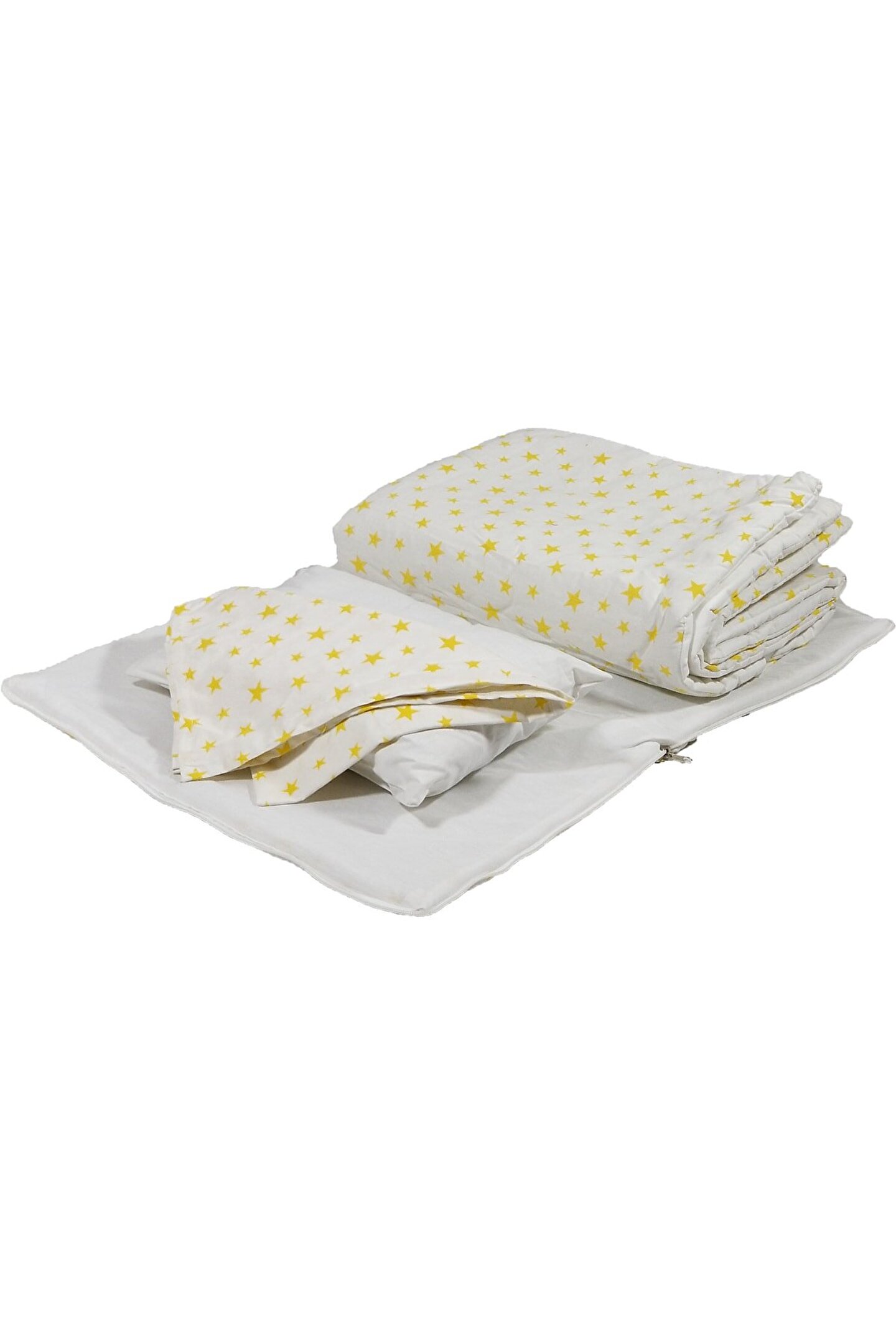 Sarı yıldızlı deseniyle şık ve neşeli bir görünüm sunar, bebeğinizin odasına renk katar; Beşik içi nevresim takımı olarak tasarlanmıştır, bebeğinizin rahat bir uyku deneyimi için idealdir;