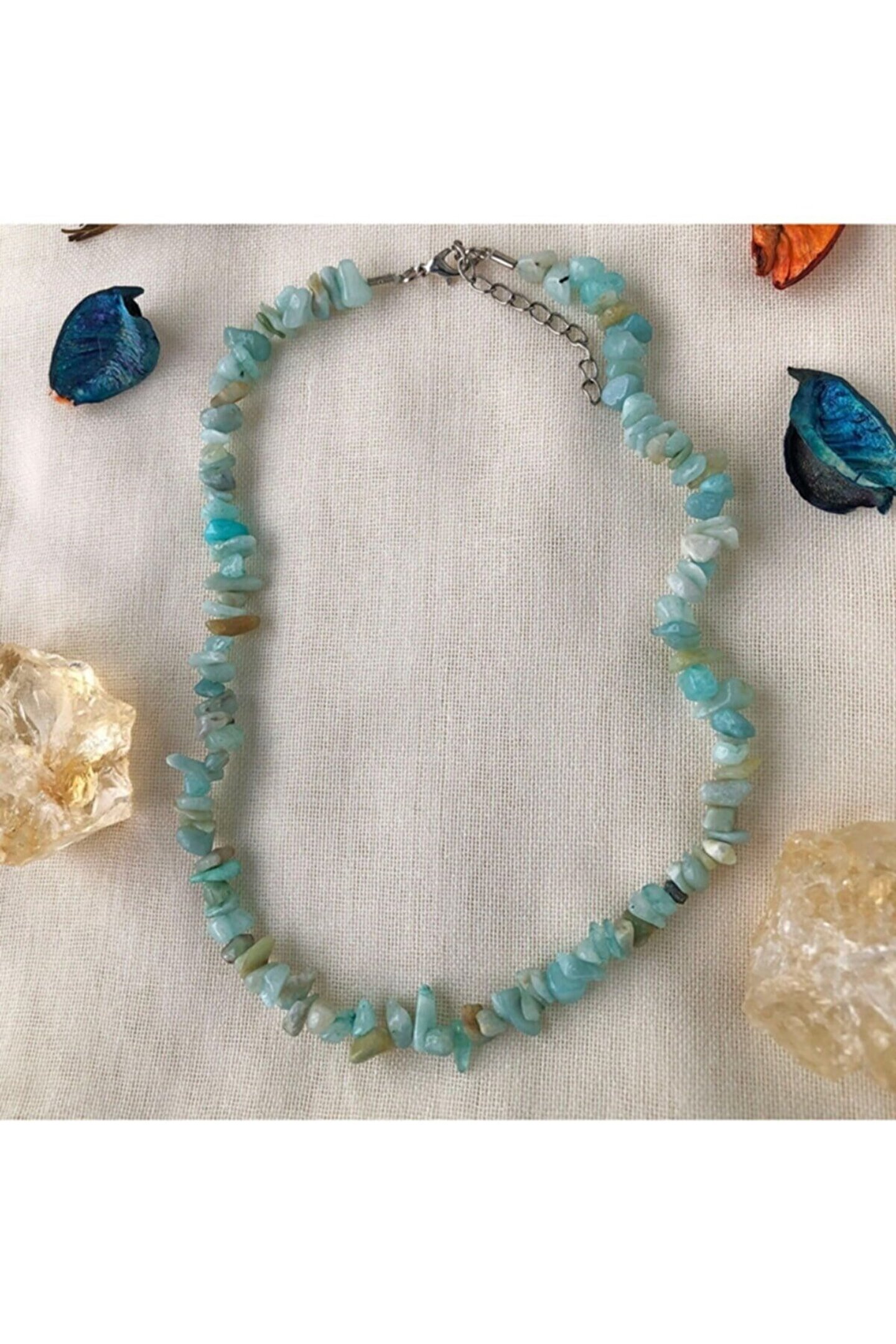 Doğal Amazonit taşı kullanılarak tasarlanmış, her bir kolye benzersiz ve özgün bir görünüm sunar; Taşın doğal yapısı ve kırıktaş formu, kolyenin hem şık hem de modern bir tarz yaratmasını sağlar; Genç yaş grubuna hitap eden tasarımıyla, günlük kullanımda rahatlıkla tercih edilebilir ve stilinizi tamamlar;