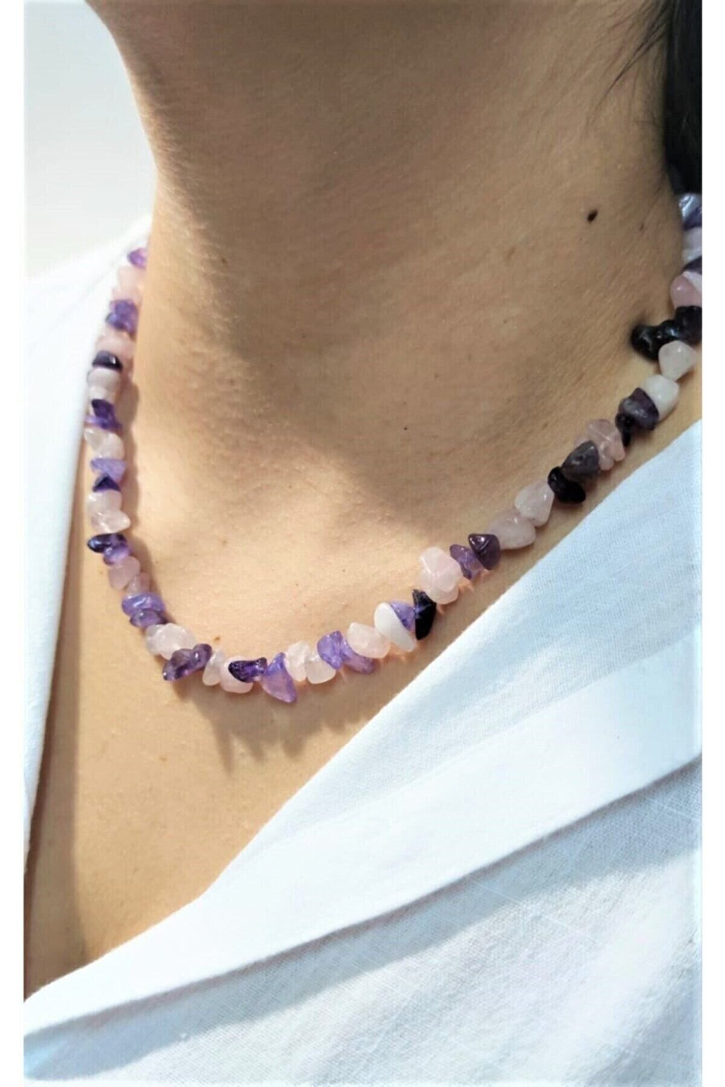 - Doğal taş kullanımı sayesinde her kolye benzersiz ve otantik bir görünüm sunar; - Ametist pembe kuvars kırıktaş, hem şıklığı hem de zarafeti bir arada barındırır; - Taşın doğal dokusu, her kıyafetle uyum sağlayarak stilinizi tamamlar;
