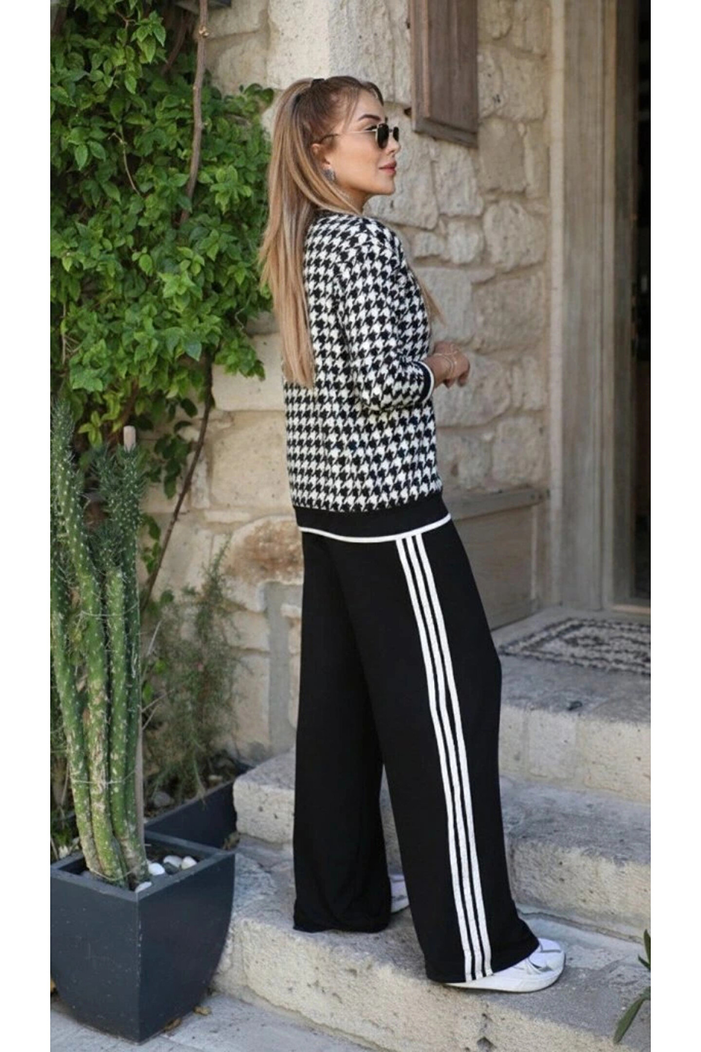 Kadın Uzun Kollu Bisiklet Yaka Kazayağı Desenli Iki Iplik Bluz Ve Viskon Iki Iplik Pantolon Ikili Takım