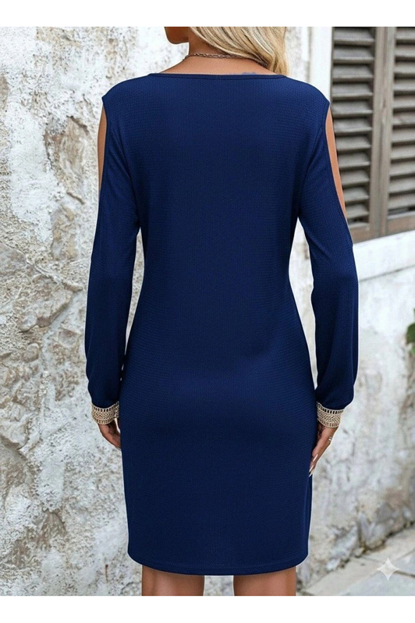 Kadın Uzun Kollu Omuzdan Açık V Dantel Yakalı Mini Waffle Elbise