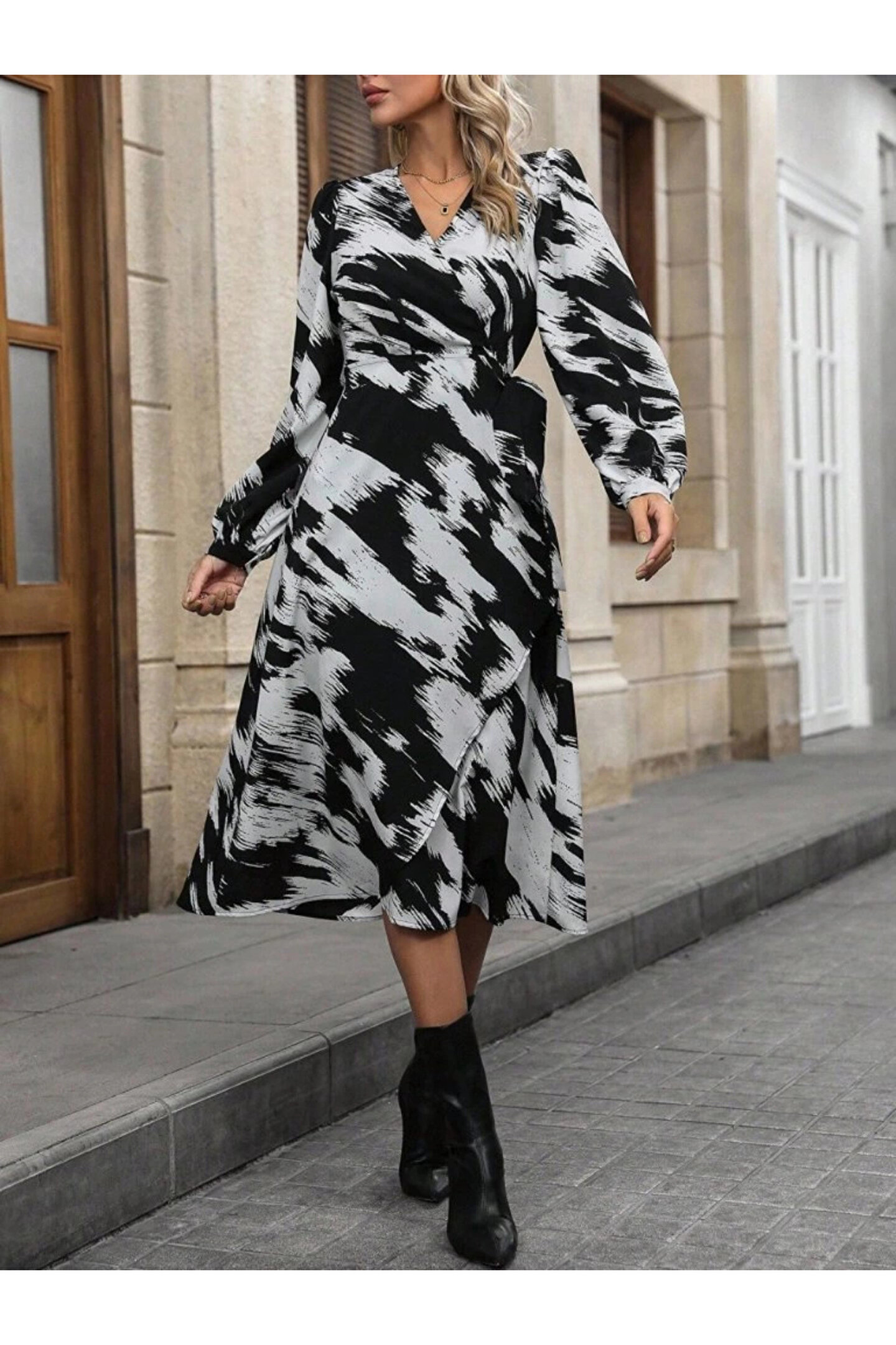 ARONA MDB Kadın Uzun Kollu Kruvaze Yakalı Yandan Bağlamalı Desenli Mini Modal Elbise