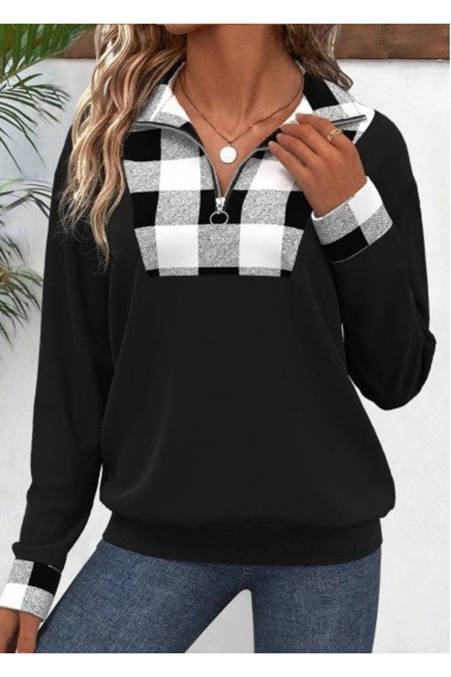 Kadın Uzun Kollu Yakalı önden Fermuarlı Ekose Detaylı Viskon Iki Iplik Bluz