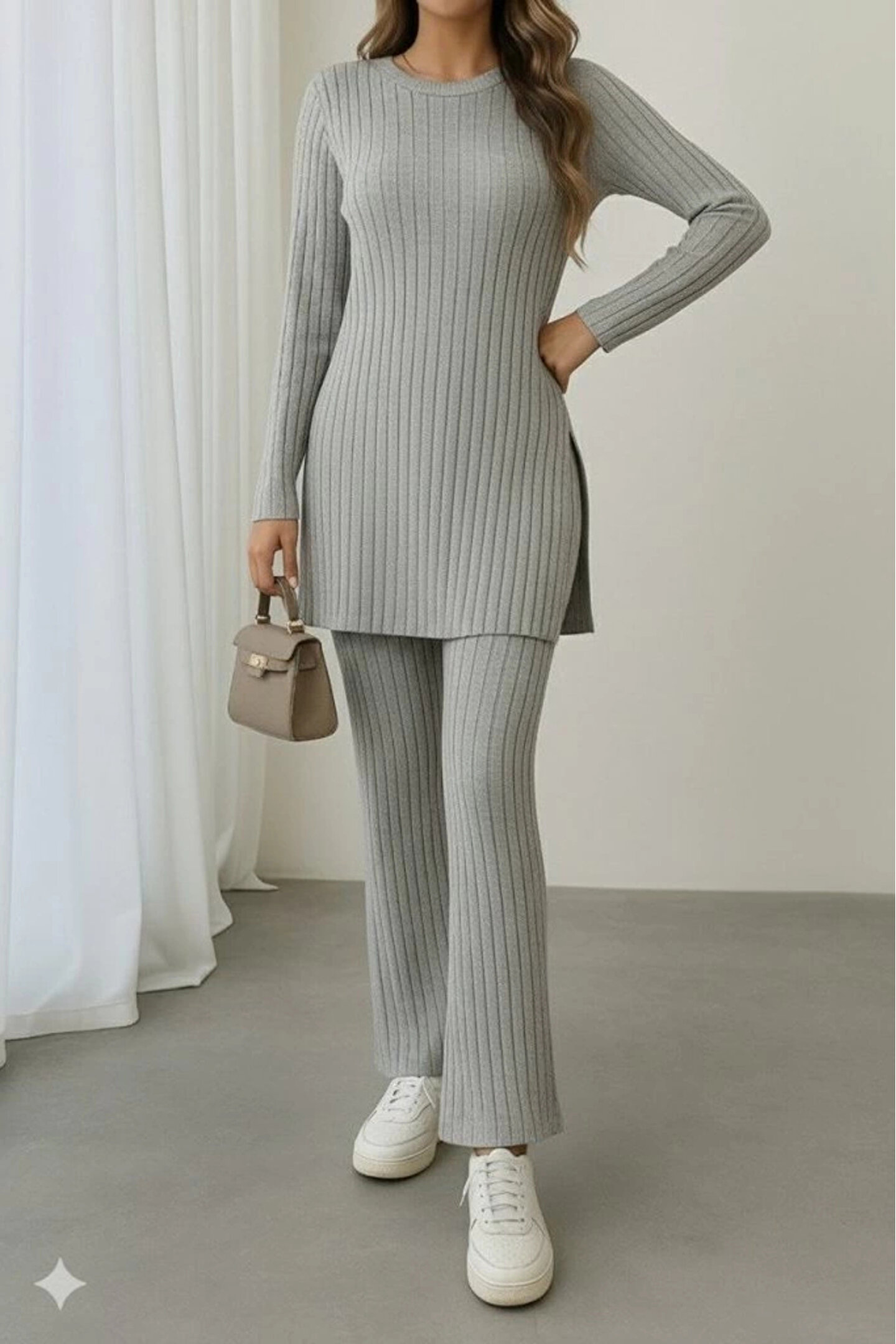 ARONA MDB Kadın Uzun Kollu Yuvarlak Yaka Yandan Yırtmaç Detaylı şardonlu Kaşkorse Bluz Ve Pantolon Ikili T
