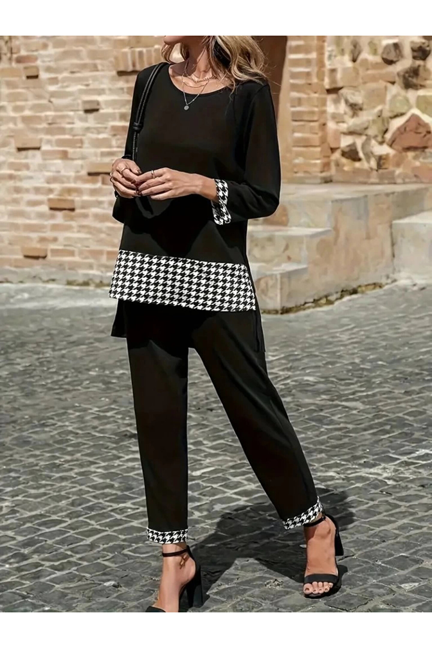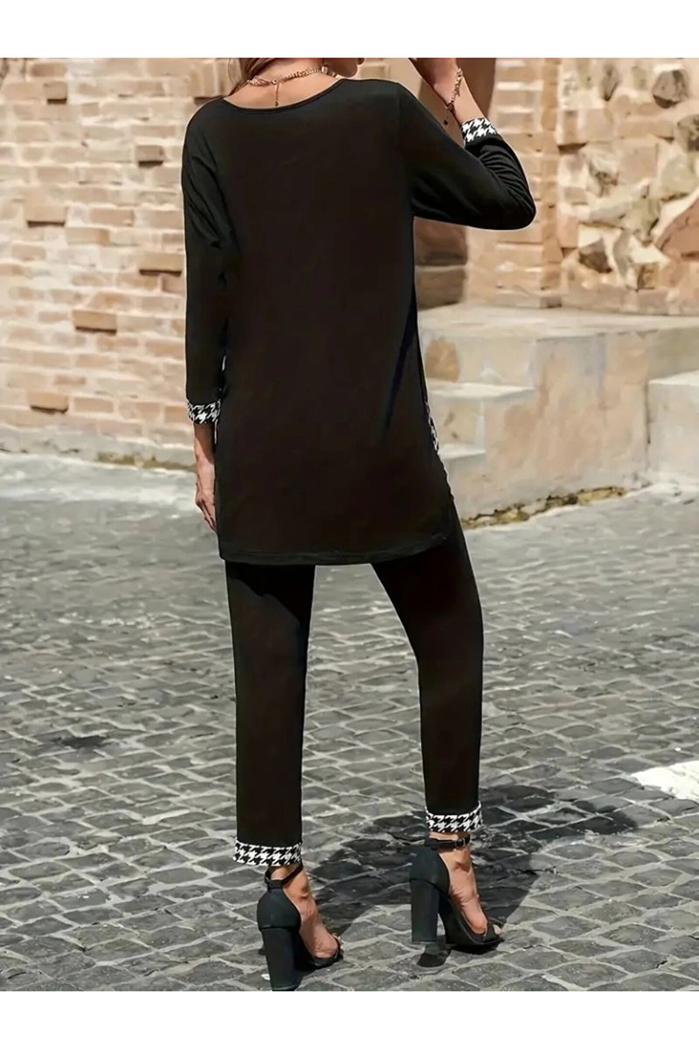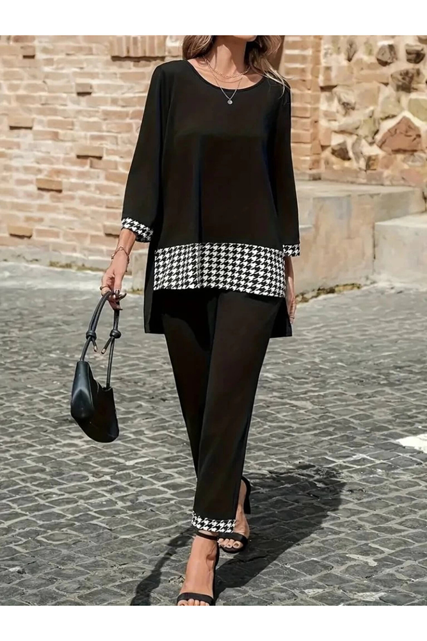 Kadın Uzun Kollu Yuvarlak Yakalı Kaz Ayağı Detaylı Viskon Iki Iplik Bluz Ve Pantolon Ikili Takım