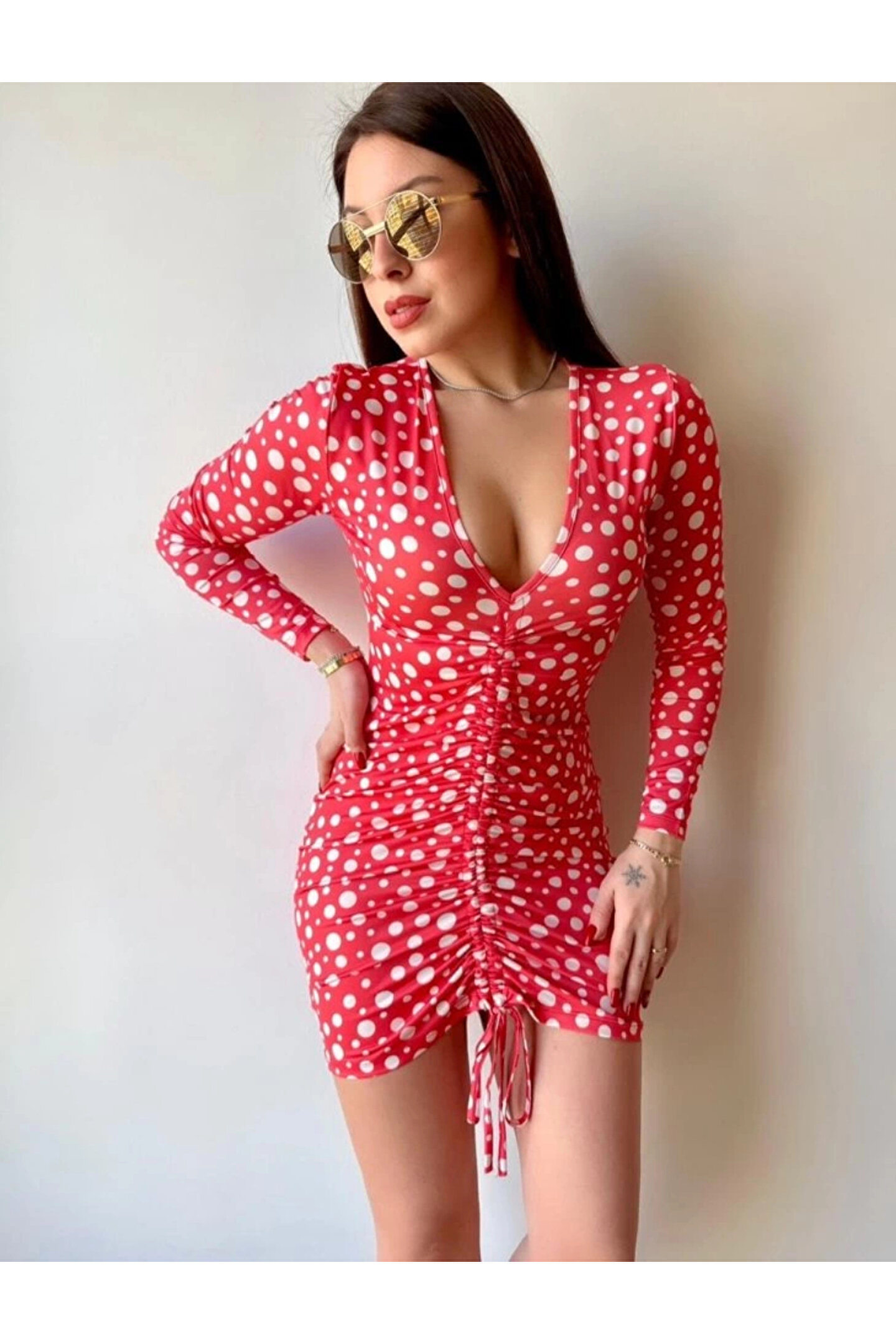 Kadın V Yaka önü Asansör Büzgü Detay Fırsat ürün Puantiyeli Mini Elbise