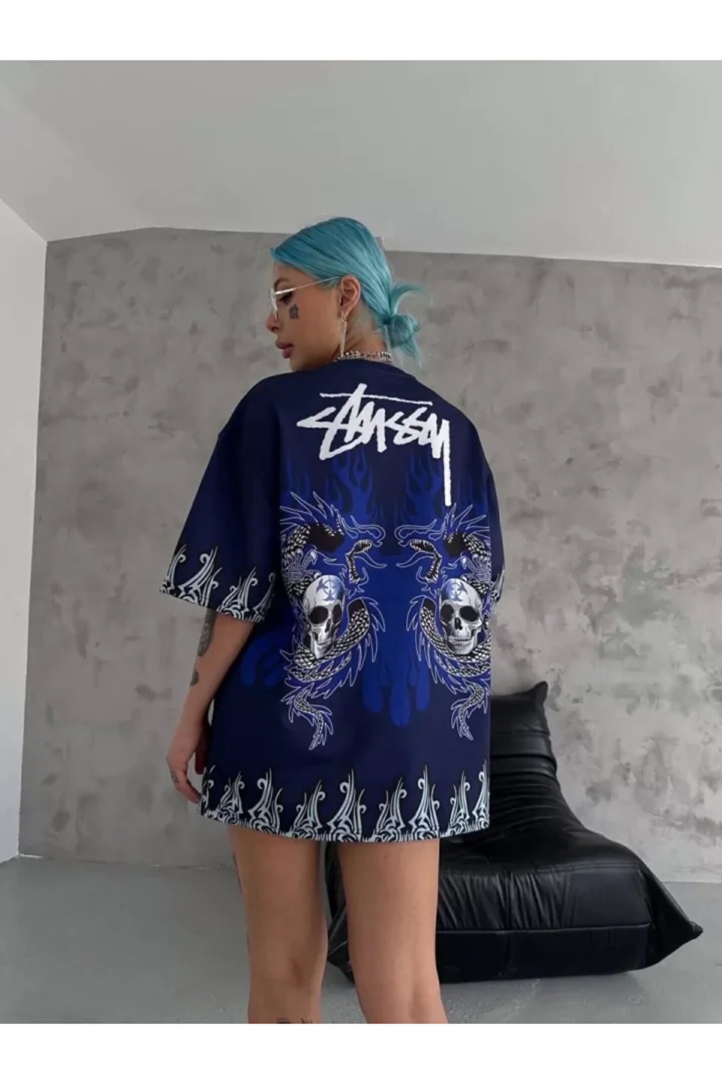 Unisex Bisiklet Yaka Baskılı Oversize T-Shirt - Lacivert Modelin Ölçüleri: Boy:165, Kg:55, Göğüs:90, Bel:72, Kalça: 100 Modelin üzerindeki ürün M/38 bedendir