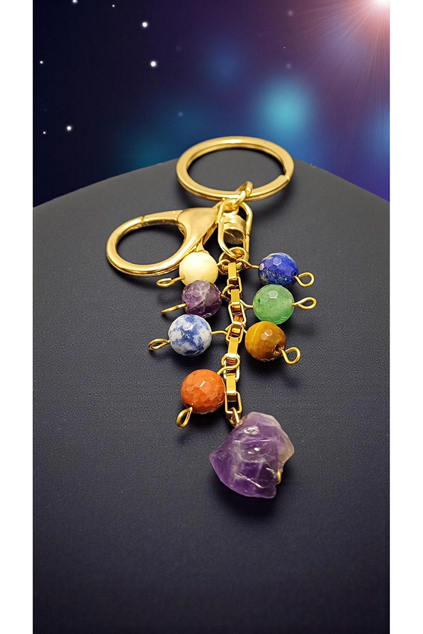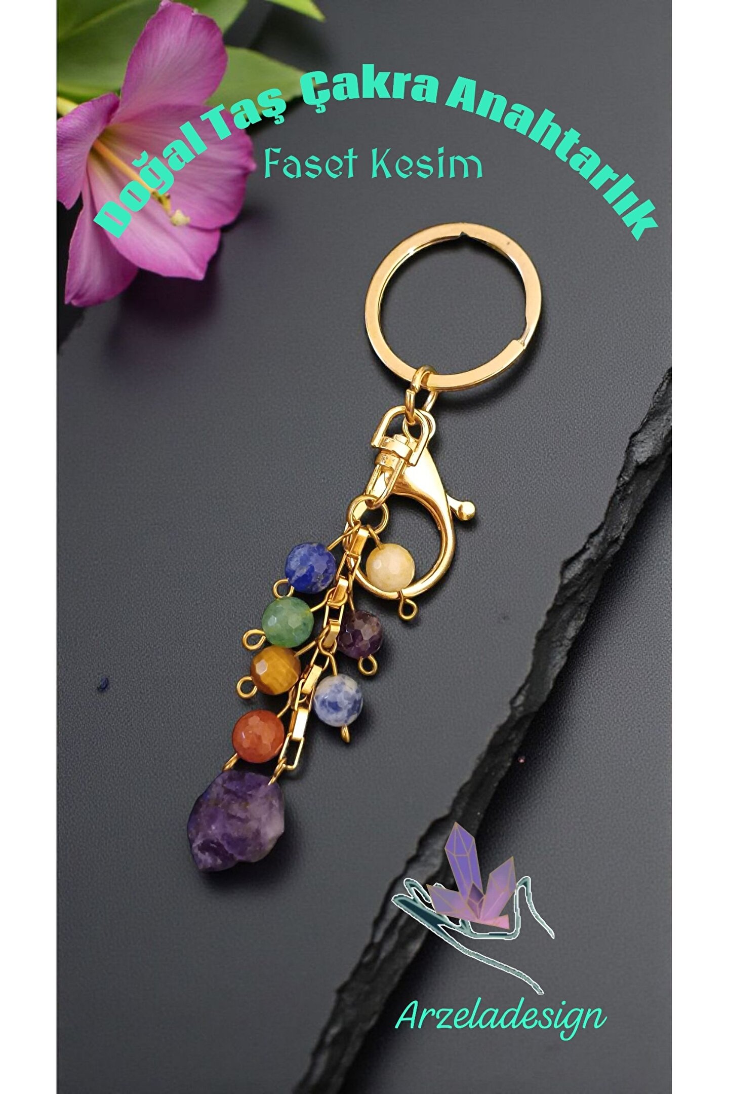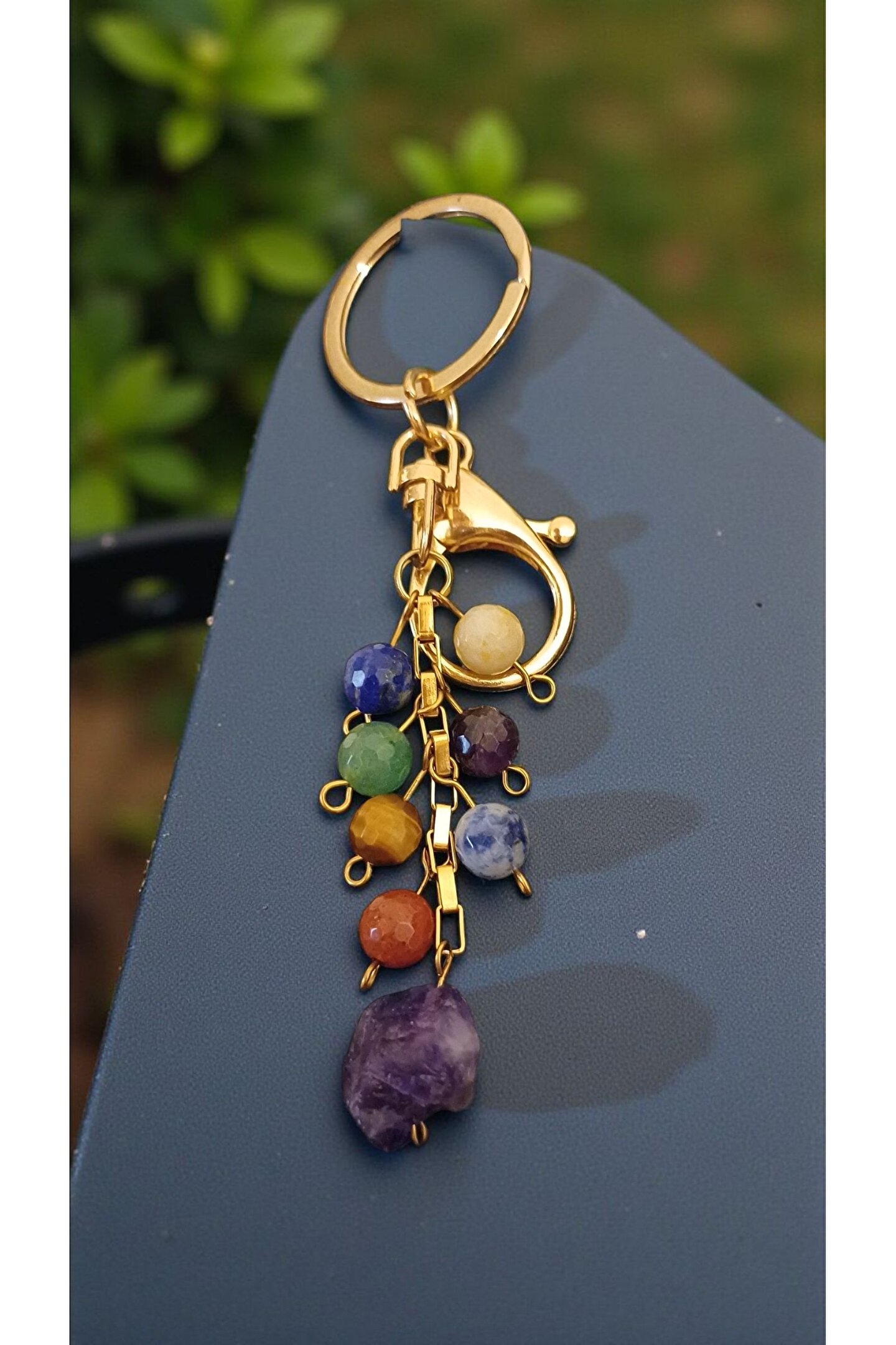 Faset Kesim 7 Çakra Taşlı Doğal Taş Anahtarlık – Çelik Zincir Aparatlı7 farklı çakra taşının enerjisini bir arada taşıyan bu özel anahtarlık, faset kesim taşların parlaklığıyla dikkat çeker.; Dayanıklı çelik zincir aparatıyla uzun ömürlü kullanım sunar.; Ürün Özellikleri:Taşlar: Ametist, Lapis Lazuli,Sodalit,Sitrin, Kaplan Gözü, Kırmızı JasperKesim: Faset (çok yüzeyli parlatılmış yüzey)Aparat: Paslanmaz çelik zincir ve halka – kararma yapmazTaşlar 8mmUç Ametist 15mmKullanım: Anahtarlık, çanta süsü veya enerji dengeleyici aksesuar olarak kullanılabilirÜretim: El işçiliği ile hazırlanmıştırNot: Doğal taşların yapısı gereği renk tonlarında ve şekillerde küçük farklılıklar olabilirSpiritüel Anlamı:Faset kesim çakra taşları; bedensel, zihinsel ve ruhsal dengeyi destekler.; Negatif enerjileri uzaklaştırır, iç huzur ve pozitif titreşimi artırır.; Aurayi dengeler ve korur