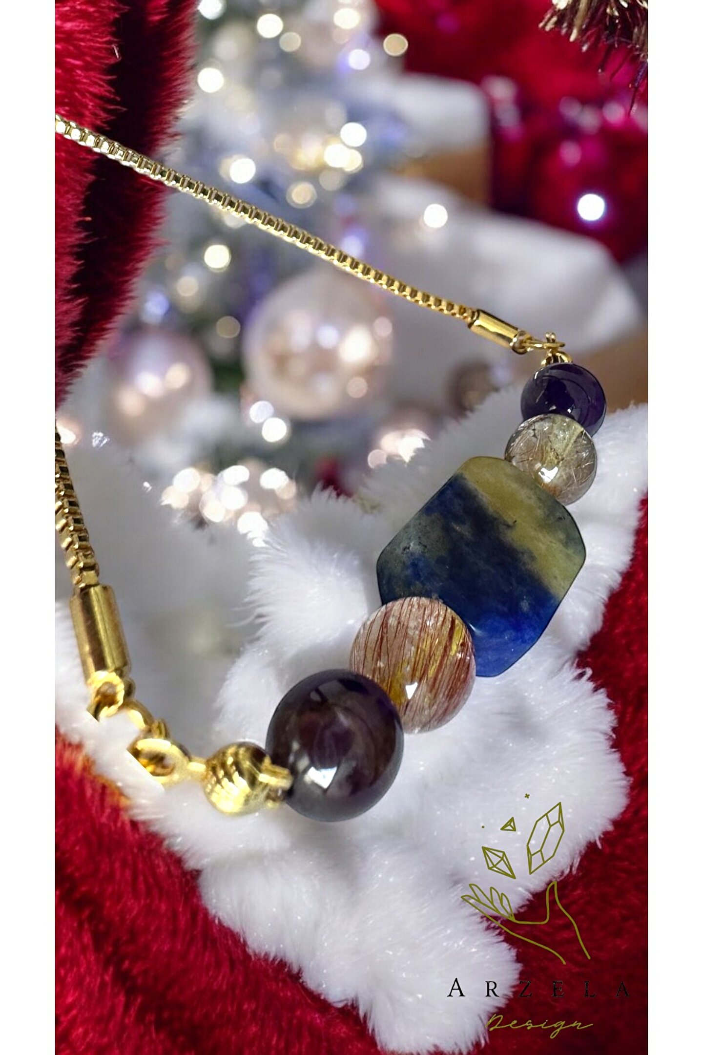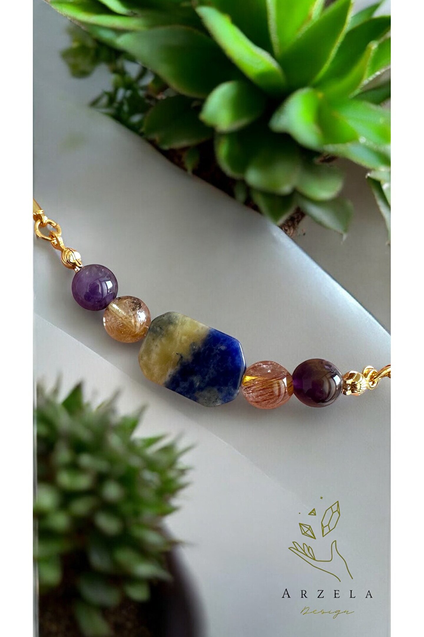 Büyük boy dikdörtgen sodalit Sıtrın Ametist taşları kullanıldı Taşların her birinin şifası bir araya gelince Yeni bir sifa,yuksek enerji ve koruma formülü oluşturdu Taşların özelliğine bakınız Kullanılan materyal altın kaplamadir Kimyasa ile temas ettirmeyiniz
