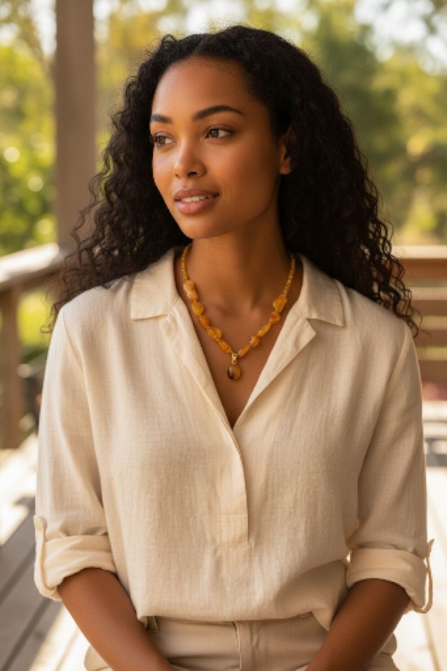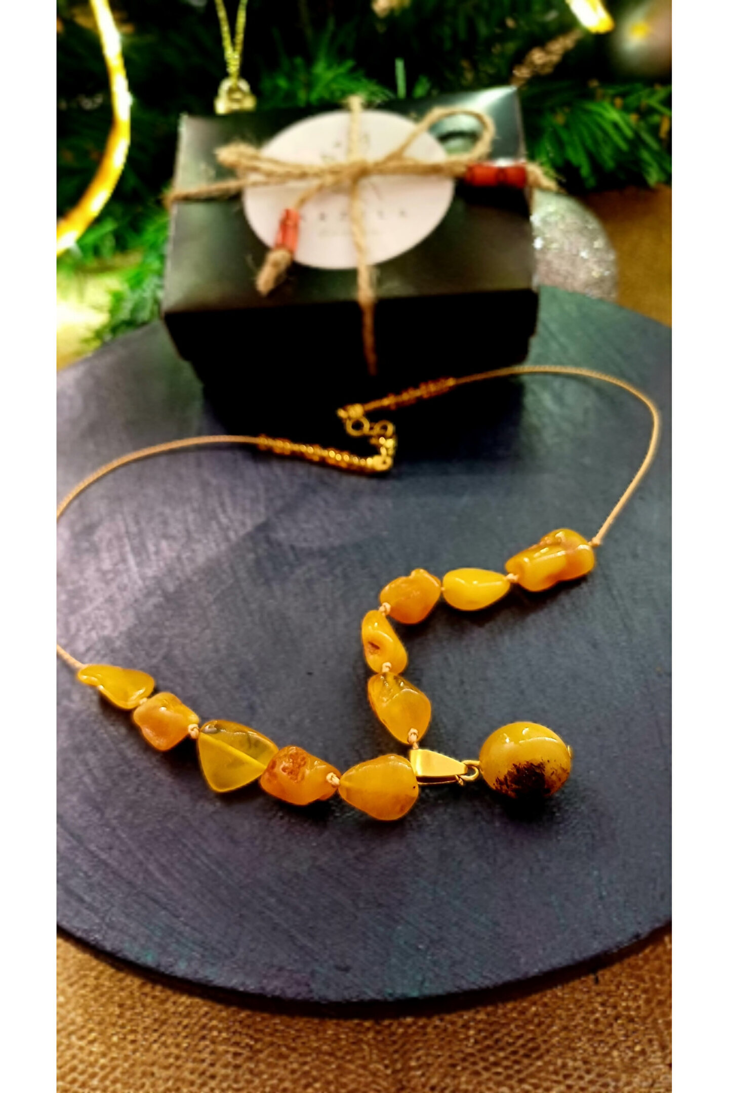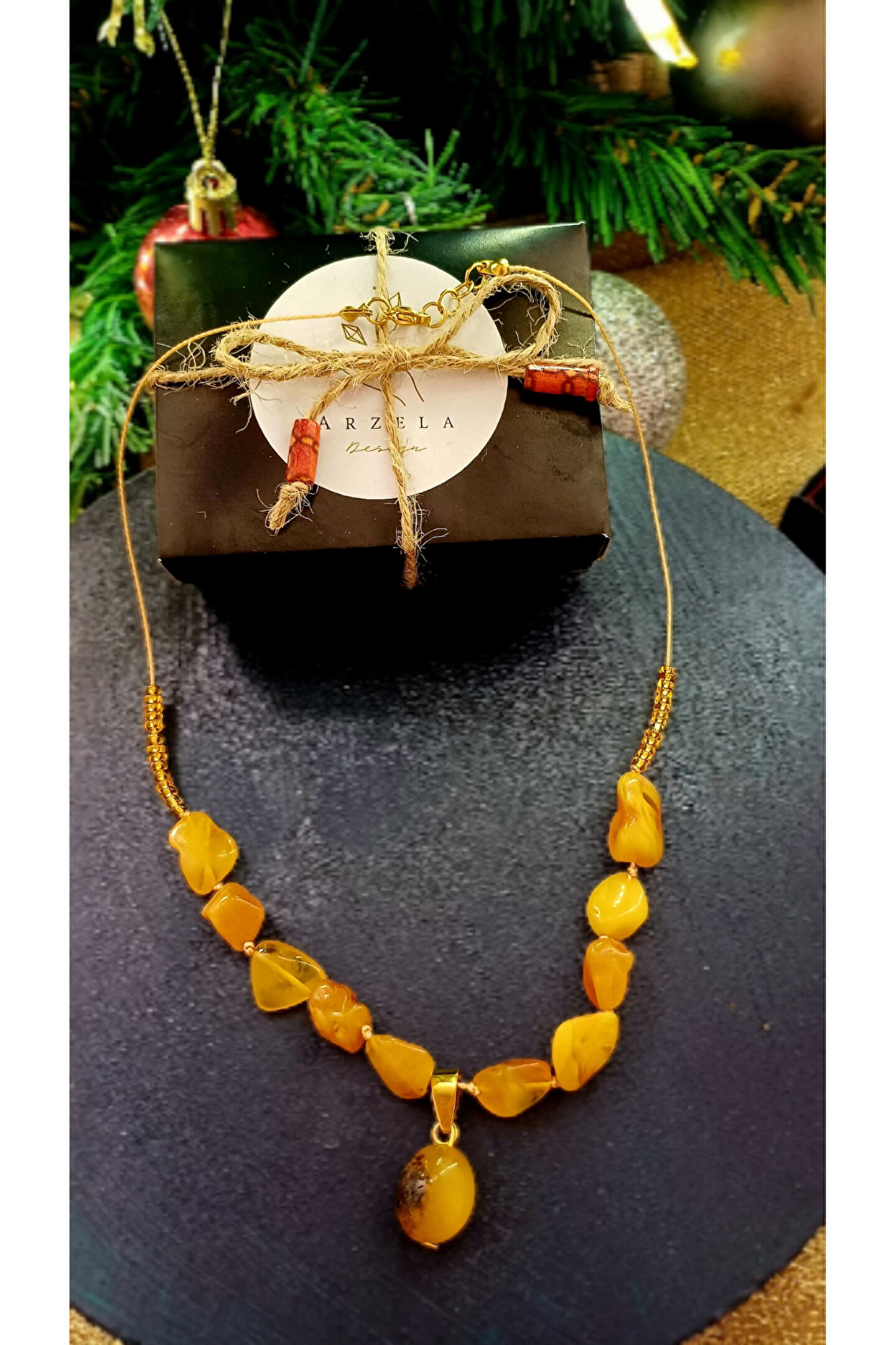Damla Kehribar kolye (çelik aparat): Doğal damla kehribar taşından yapılmış kolye; metal kısmı (zincir / aparat) paslanmaz çelik — bu da kolyenin uzun ömürlü, dayanıklı ve günlük kullanıma uygun olmasını sağlar.; Fosilleşmiş ağaç reçinesidir, çok hafif ve sıcaktır.; Negatif enerjiyi azalttığına ve nazardan koruduğuna inanılır.; Stres, huzursuzluk ve gerginliği hafiflettiği söylenir.; Bebeklerde diş kaşıma döneminde rahatlatıcı etkisi olduğuna inanılır.; Doğal, sıcak tonlu ve şık bir taştır; kolye ve bilekliklerde sık kullanılır.
