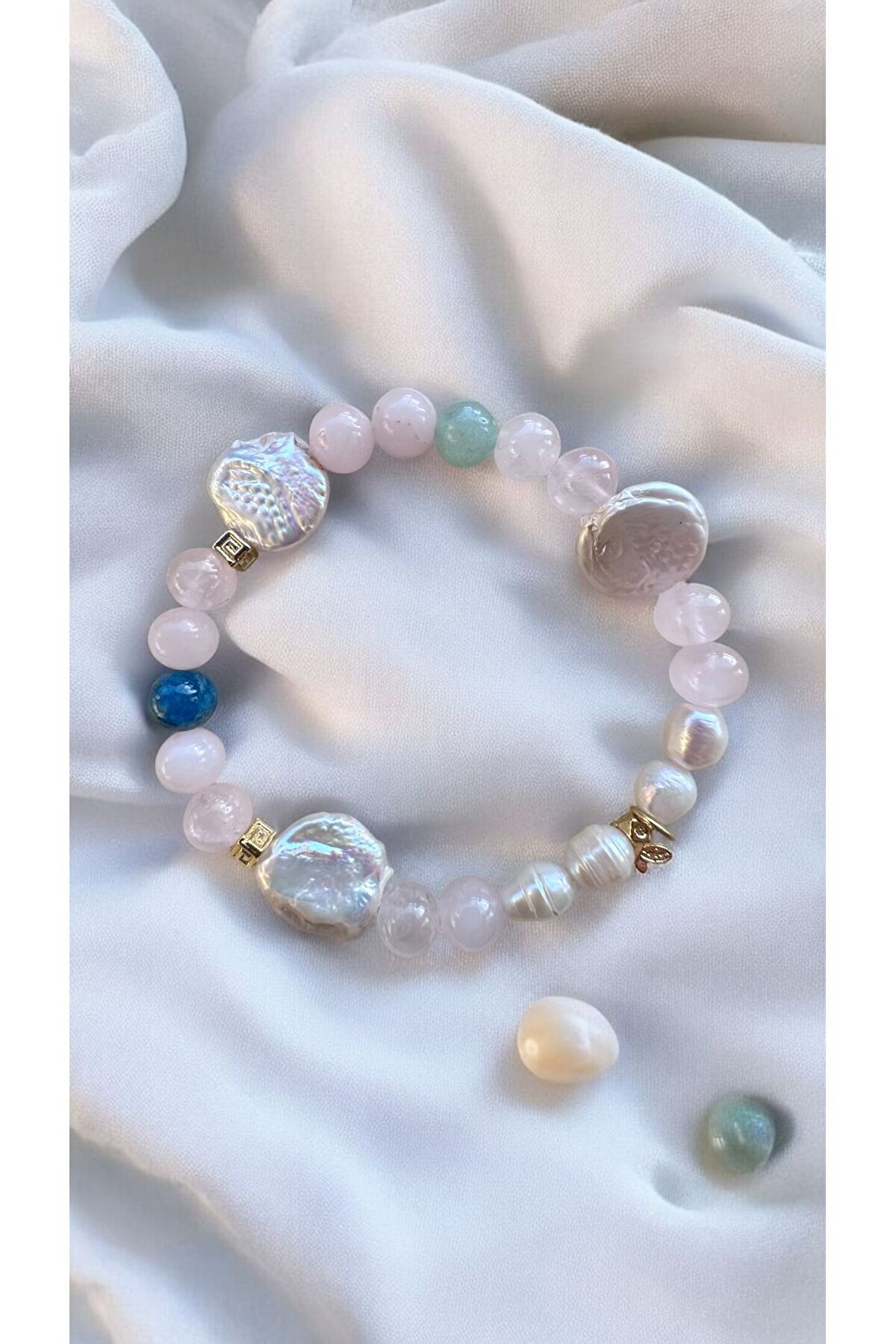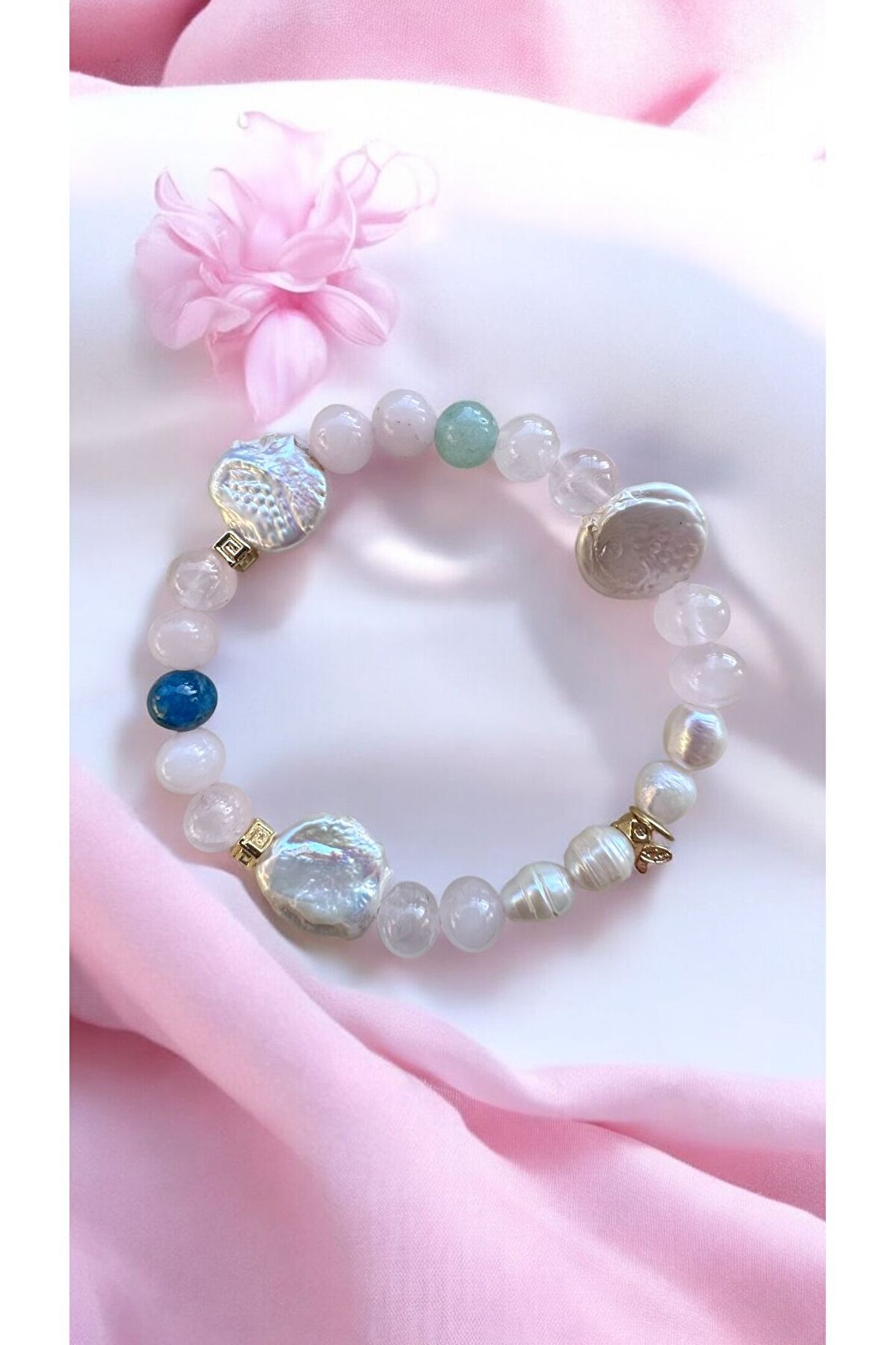 Dişil enerjiyi saflığı ve zerafeti temsil eden İNCİ Aşkı temsil eden PEMBE KUVARS,bereket, sezgi ve uğur taşı olan AVENTURİN İlham taşı olan APATIT Pozitif enerjiyi toplayan altıncı hissi, sevgi ve şefkat duygularını güclendiren KRİSTAL KUVARS ile formullenen bu bileklik Saf Aşk ve Disil Enerji Bilekliğidir Bu bileklik özel olarak sayılar ve taşların özel sifasi ile formüle edilmiştir Her taşın sifasi yanına gelen diğer taslar ile farklı bir hal alır.; Yeni bir formül olusur Materyal altin kaplamadir su ve kimyasala temas ettirmeyiniz Kutuda ve yedek misina ile gonderilecektir