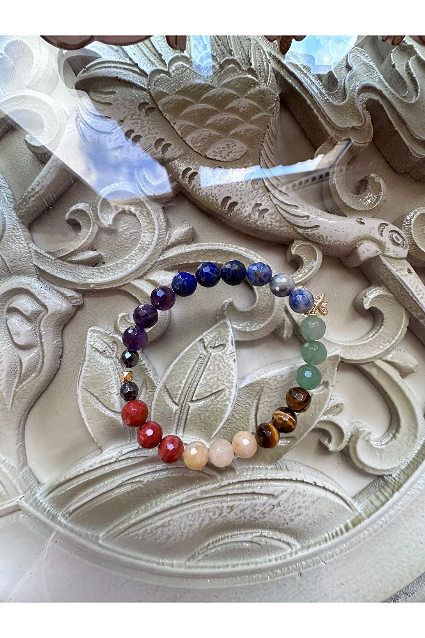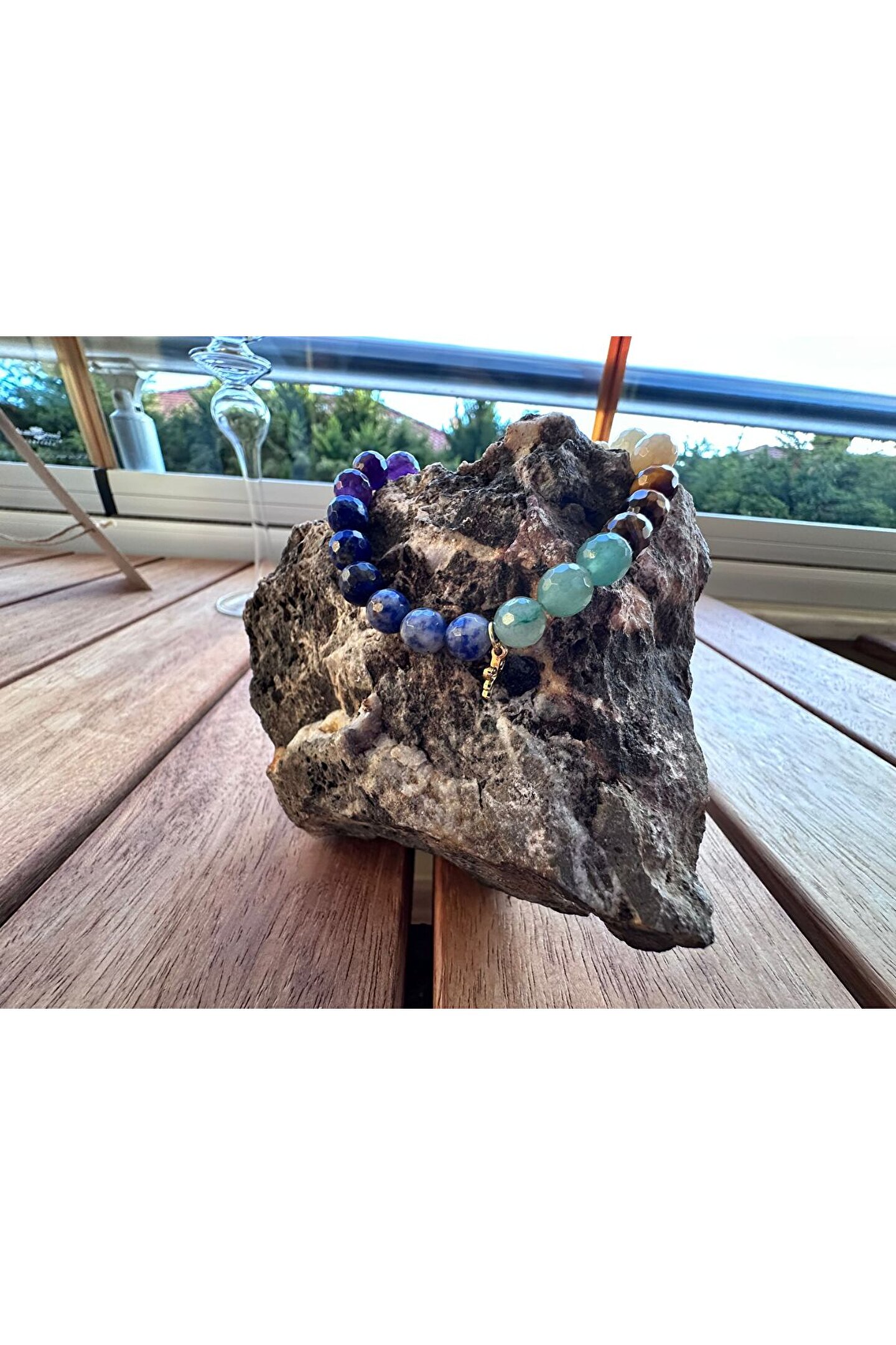 Ametist ; Krizokol ; Lapis Lazuli ; Aventurin ; Kaplan Gözü ; Sarı Opal ; Jasper ; Hematit ; Gümüş kaplama aparat ; Her tasın şifası yanına gelen taşlarla farklı hal alır,formüllenir.; ; Taslar 7 cakraya hitap eder Bedeni topraklar,olumsuz enerjiden arındırır,korur Kişiye sükunet verir Zihni sakinlestirir Düşünceleri netlestirir