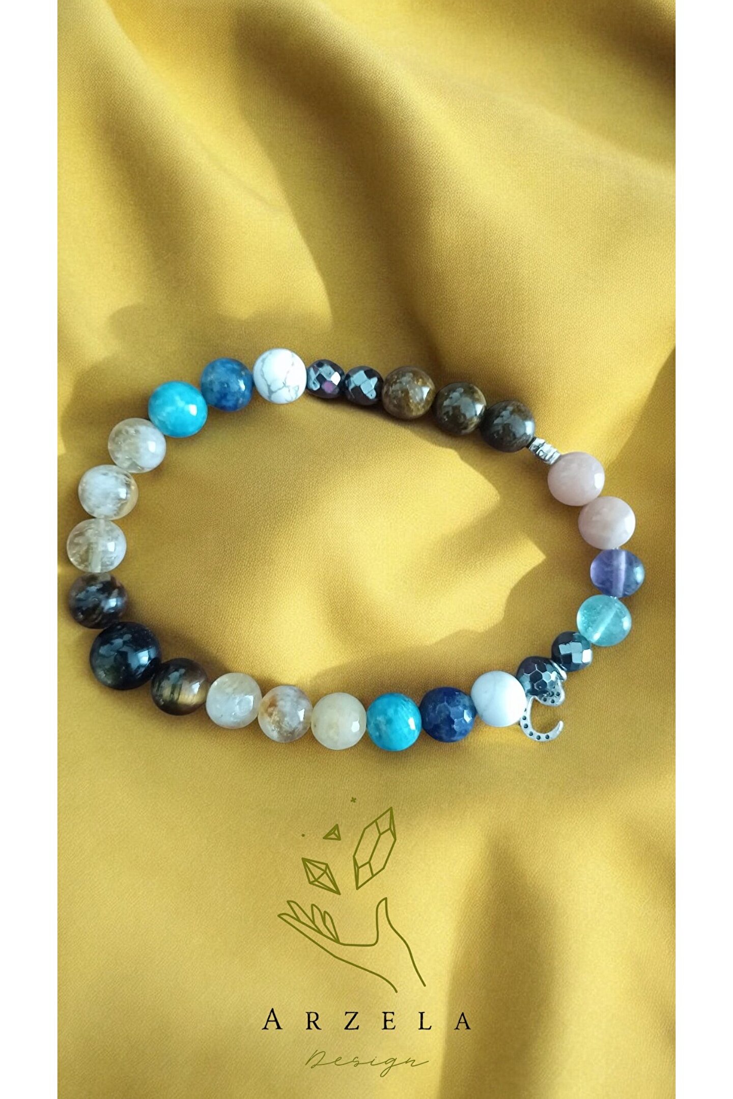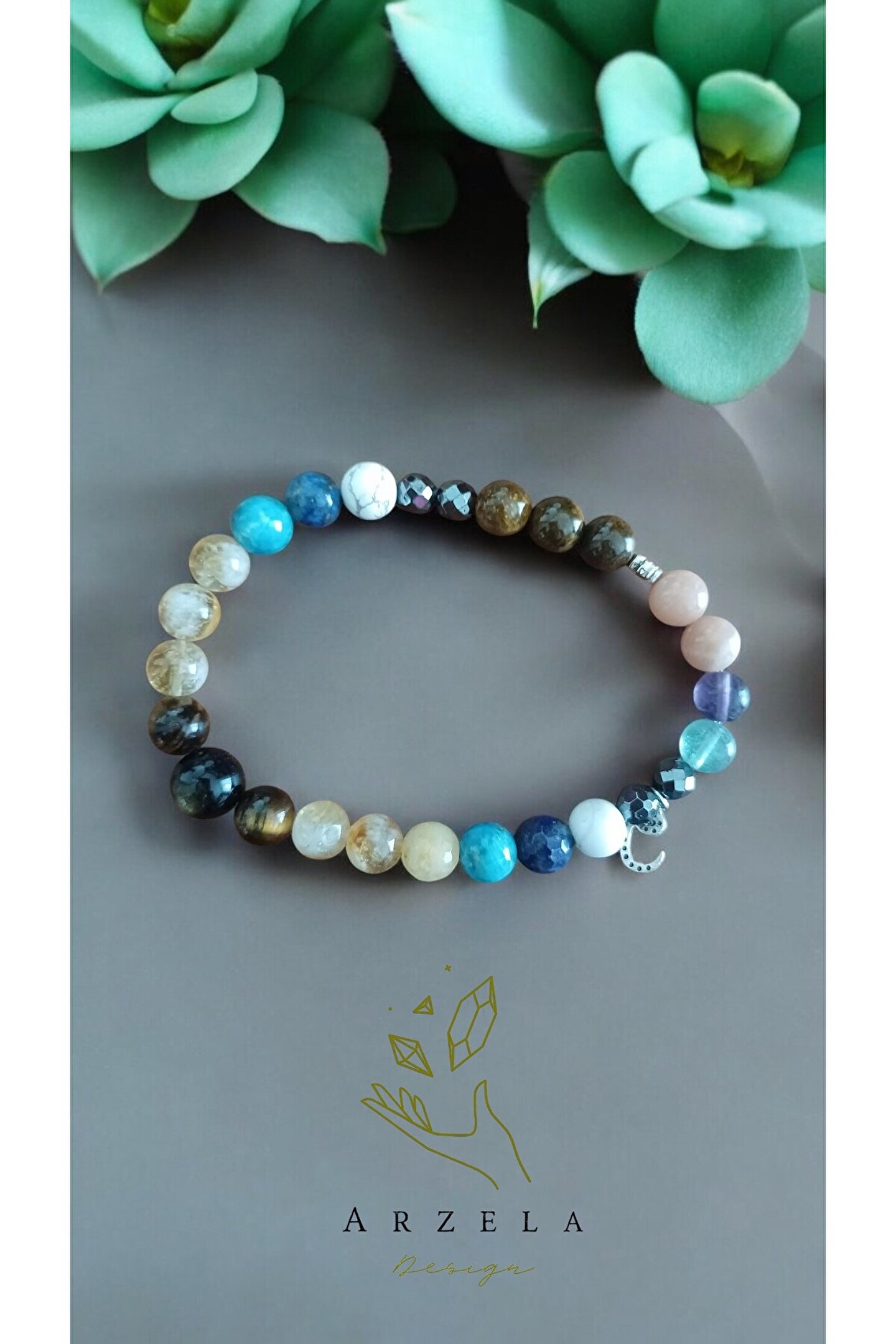 PEMBE KUVARS(İKİ GÖNÜL) ; KAPLAN GÖZÜ ; OBSİDYEN ; SITRIN ; FLORID ; APATIT ; HEMATİT ; GOLDEN HEALER ; HAVLIT taşları değerlerine göre bir araya getirilerek bedensel ve zihinsel denge ile sakinlik amaçlanmıştır ; Taşların özelliklerine bakınız Aparatlar gümüş kaplamadir Nem ve kimyasalla temas ettirmeyiniz Ürün kutu içerisinde yedek misina ve iki adet taşla birlikte gönderilecektir