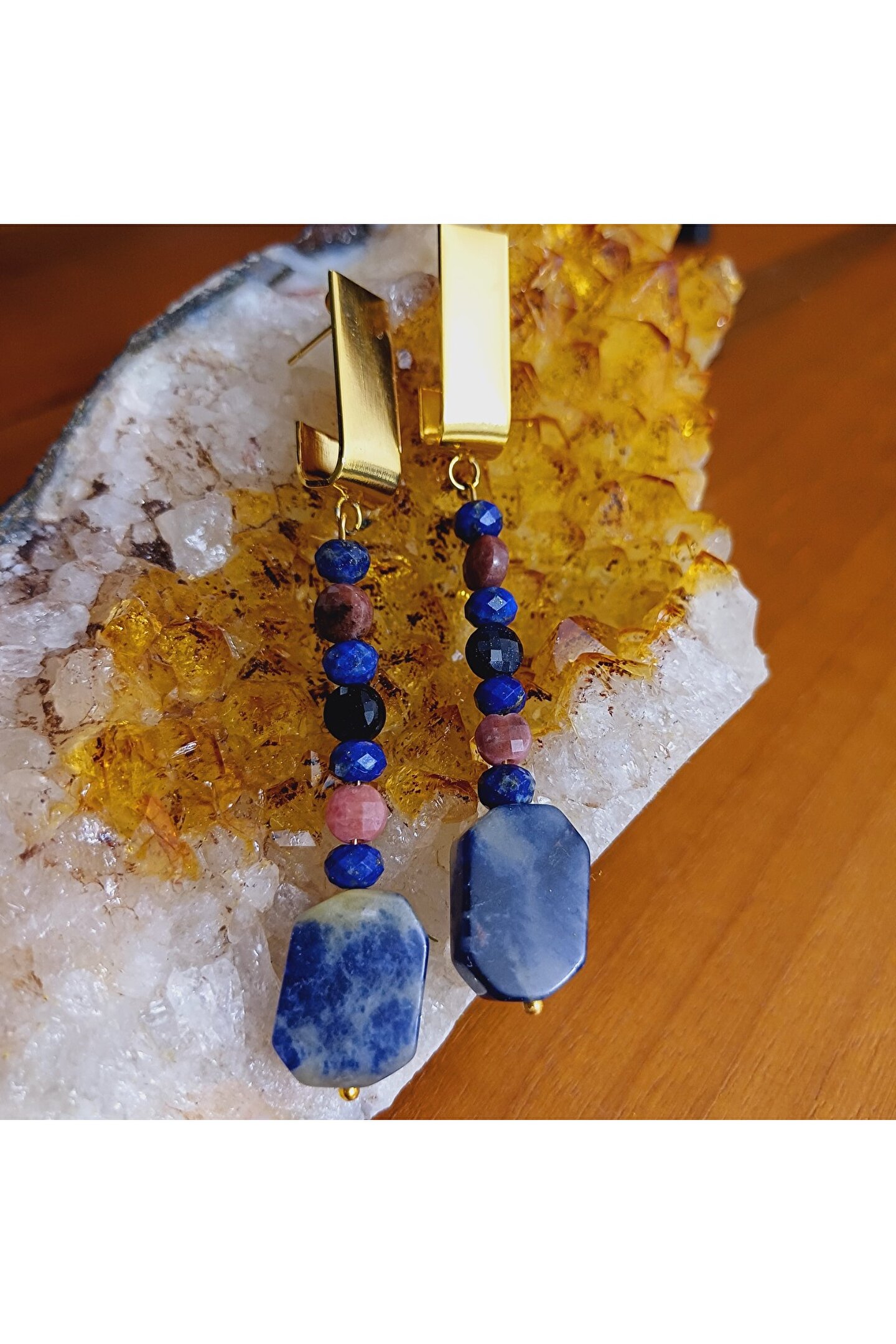Sodalit Sağduyu Fasetli Lapis lazuli özgüvenle ifade Rodinut Öz sevgi Kendini tanimak,sevmek ve ifade edebilmek isteyenler icin tasarlandi Şıklık ve Konruma bir arada Materyal altin kaplamadir Su ve nemden koruyunuz