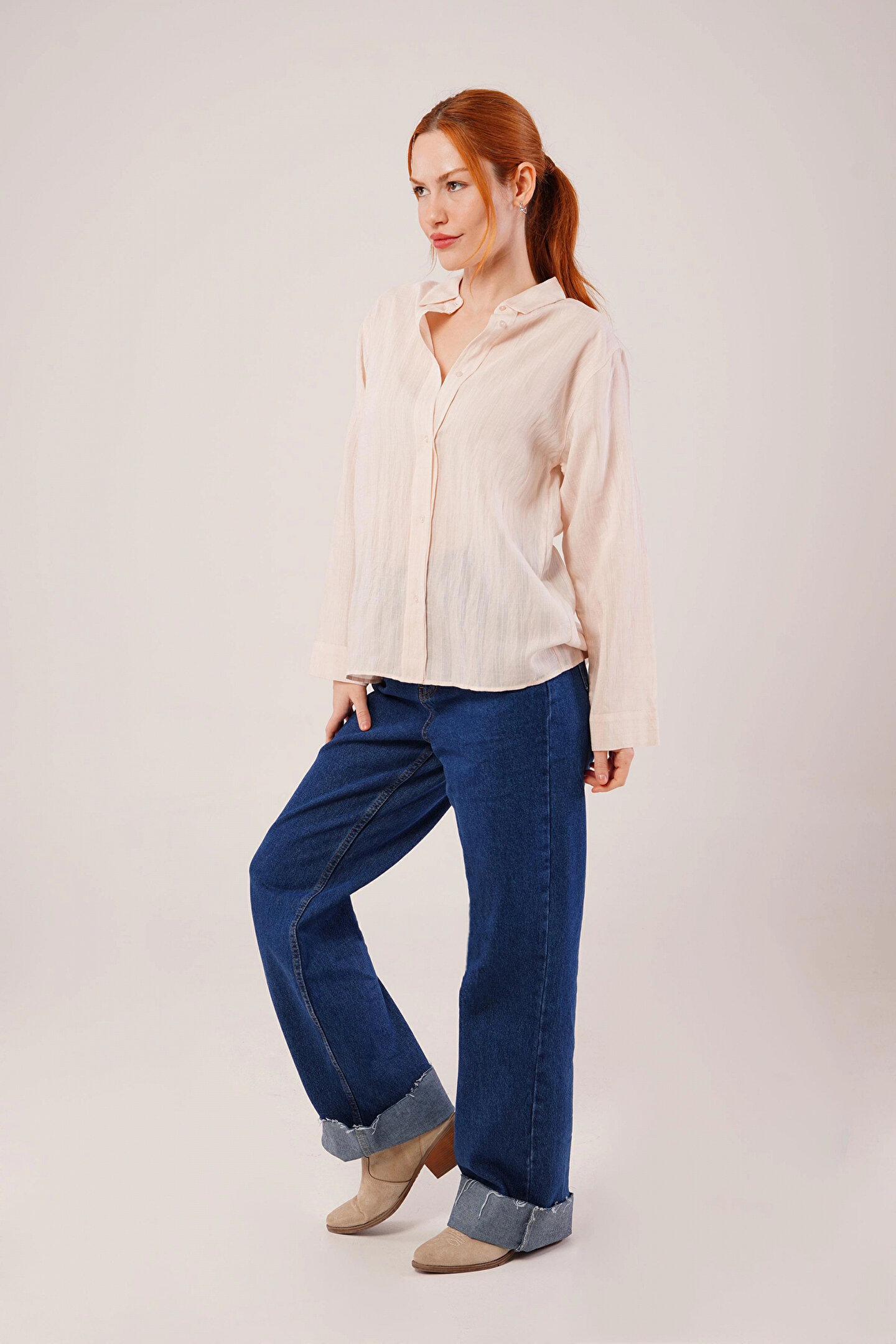 Düğmeli Ve Çizgi Detaylı Krem Gömlek