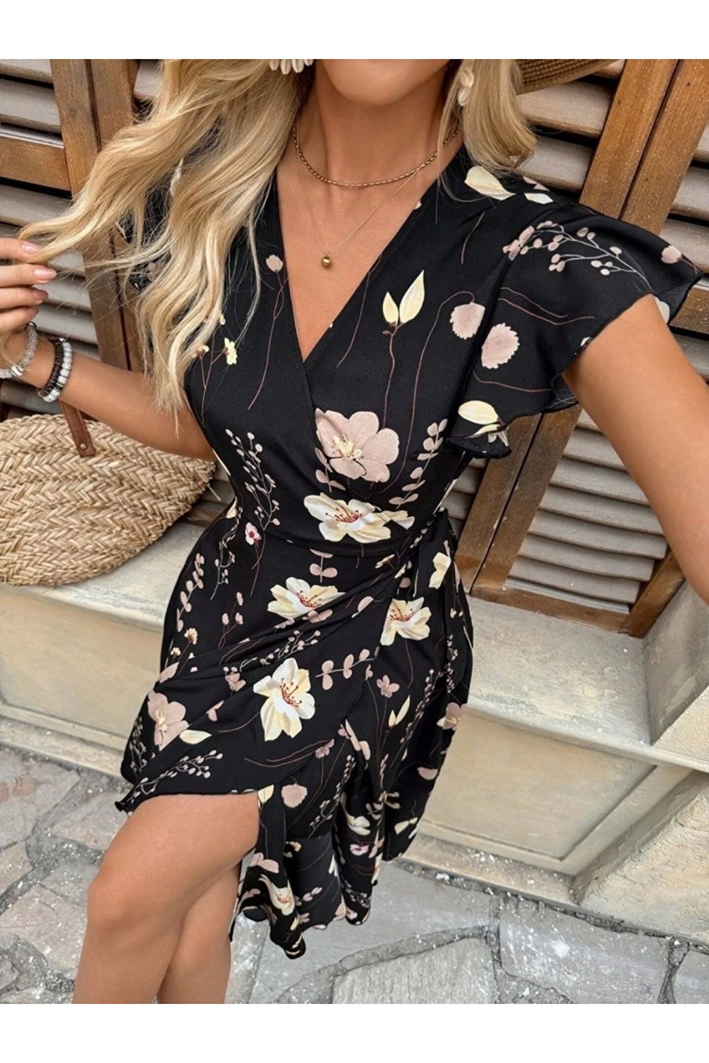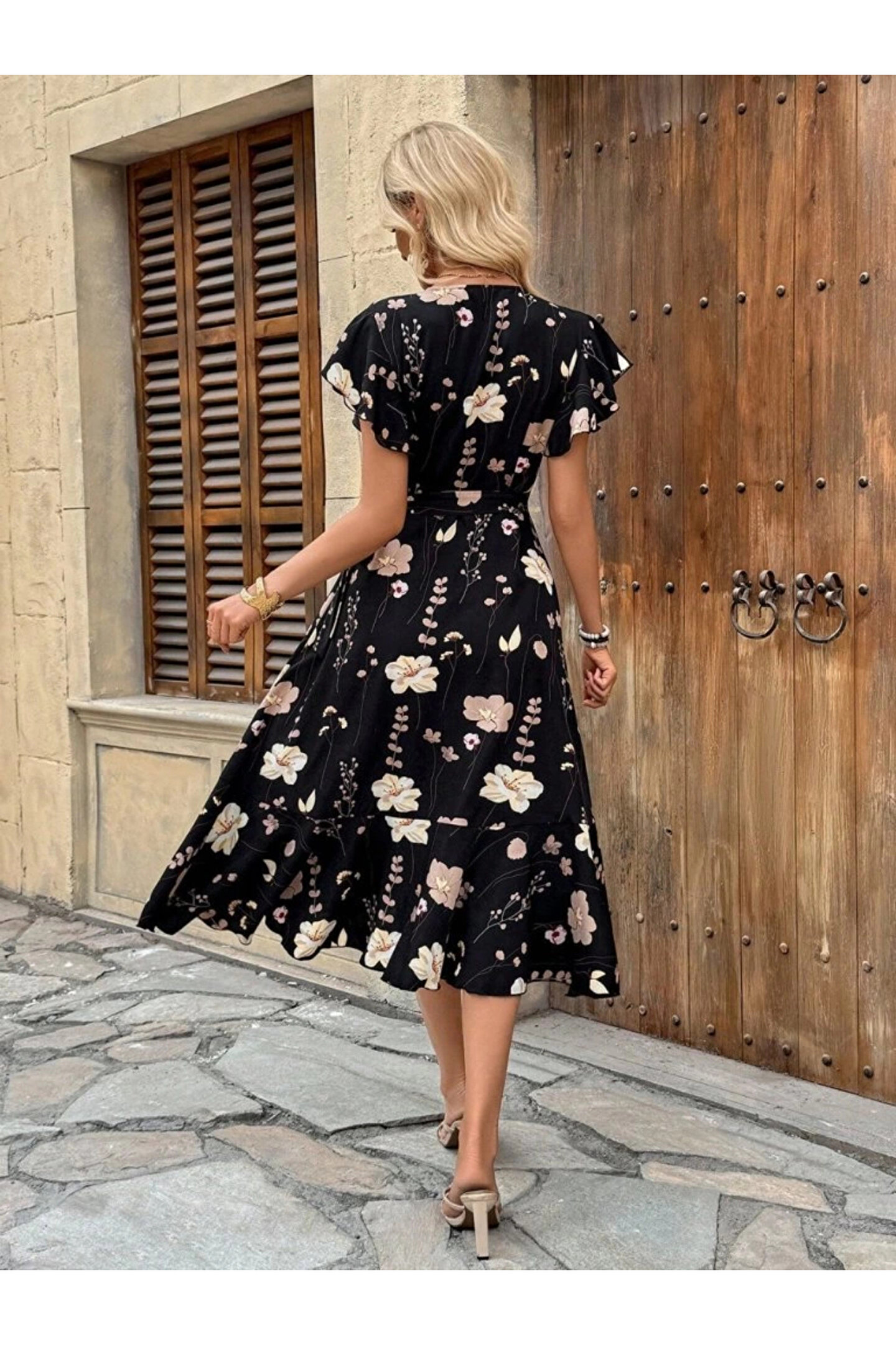 Kadın Kısa Kelebek Kollu Kruvaze Yakalı Belden Kuşaklı Midi Süprem Elbise