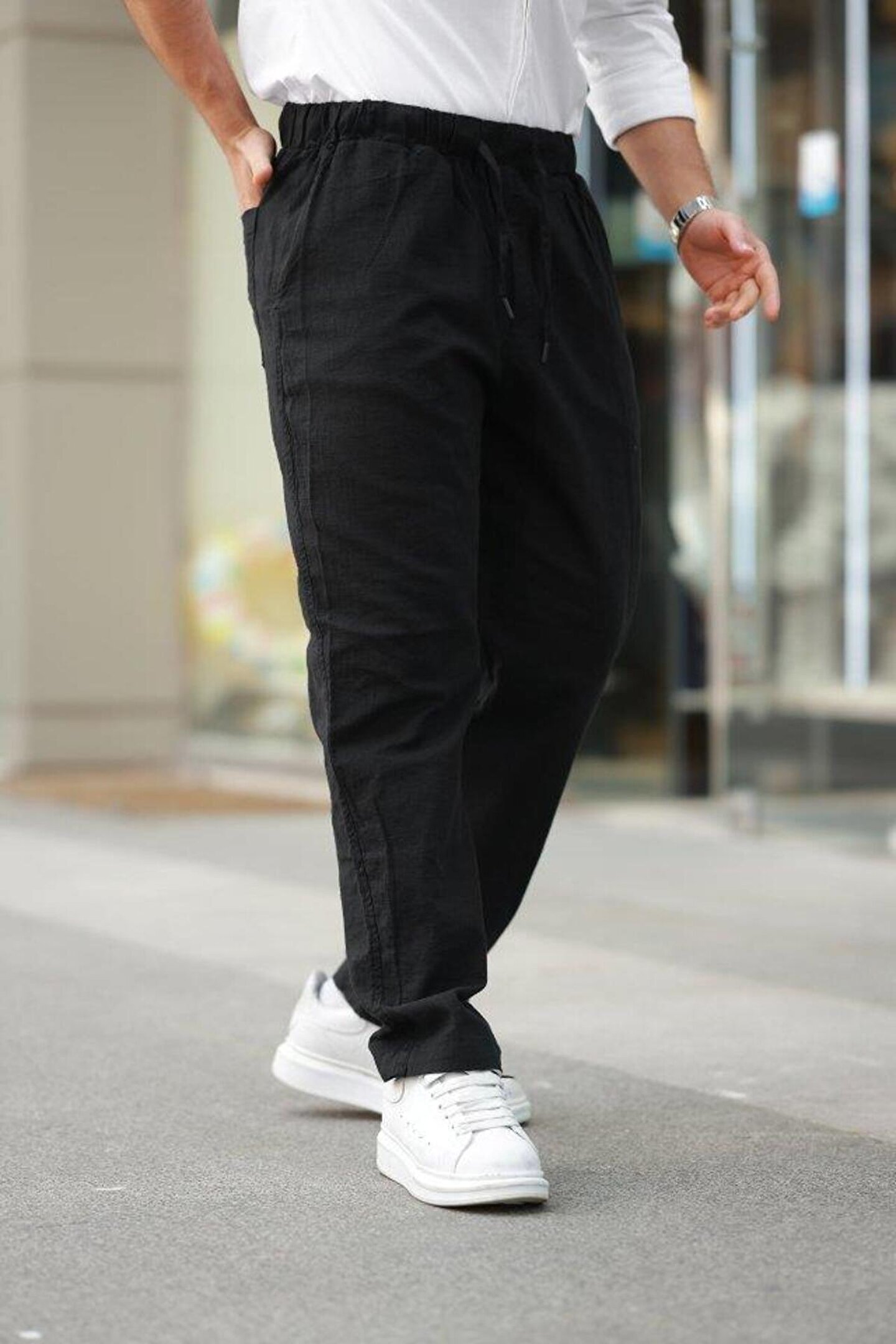 Erkek Beli Lastikli Keten Rahat Pantolon
