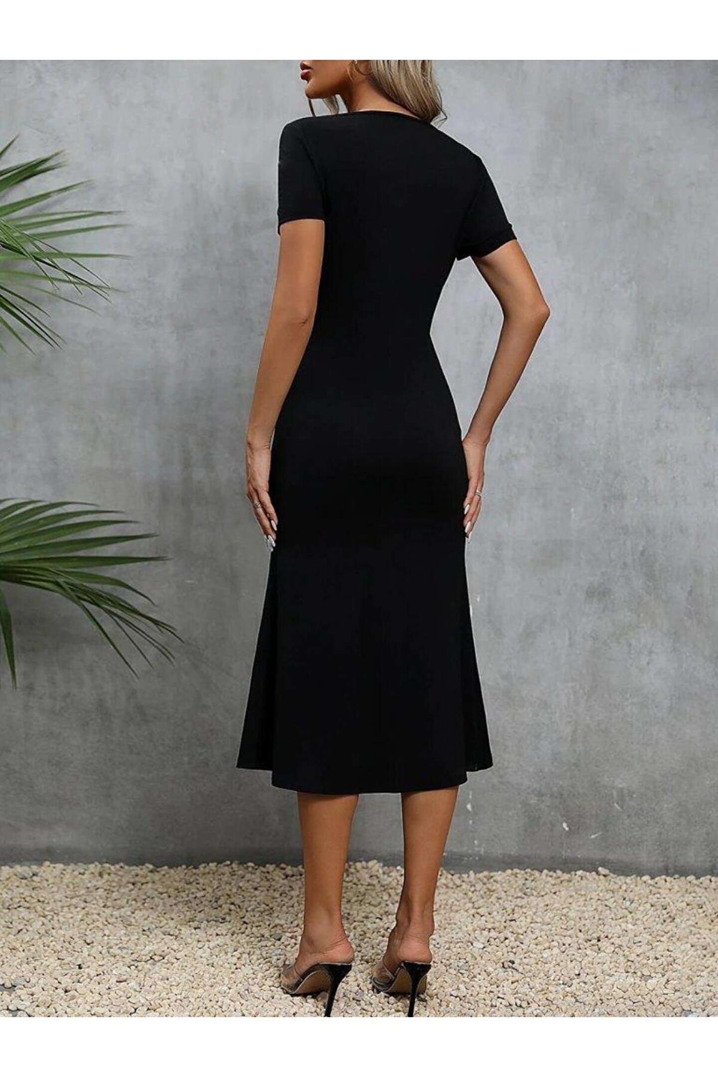 Kadın Kısa Kollu Kare Yakalı Ip Detaylı Janjan Krep Elbise