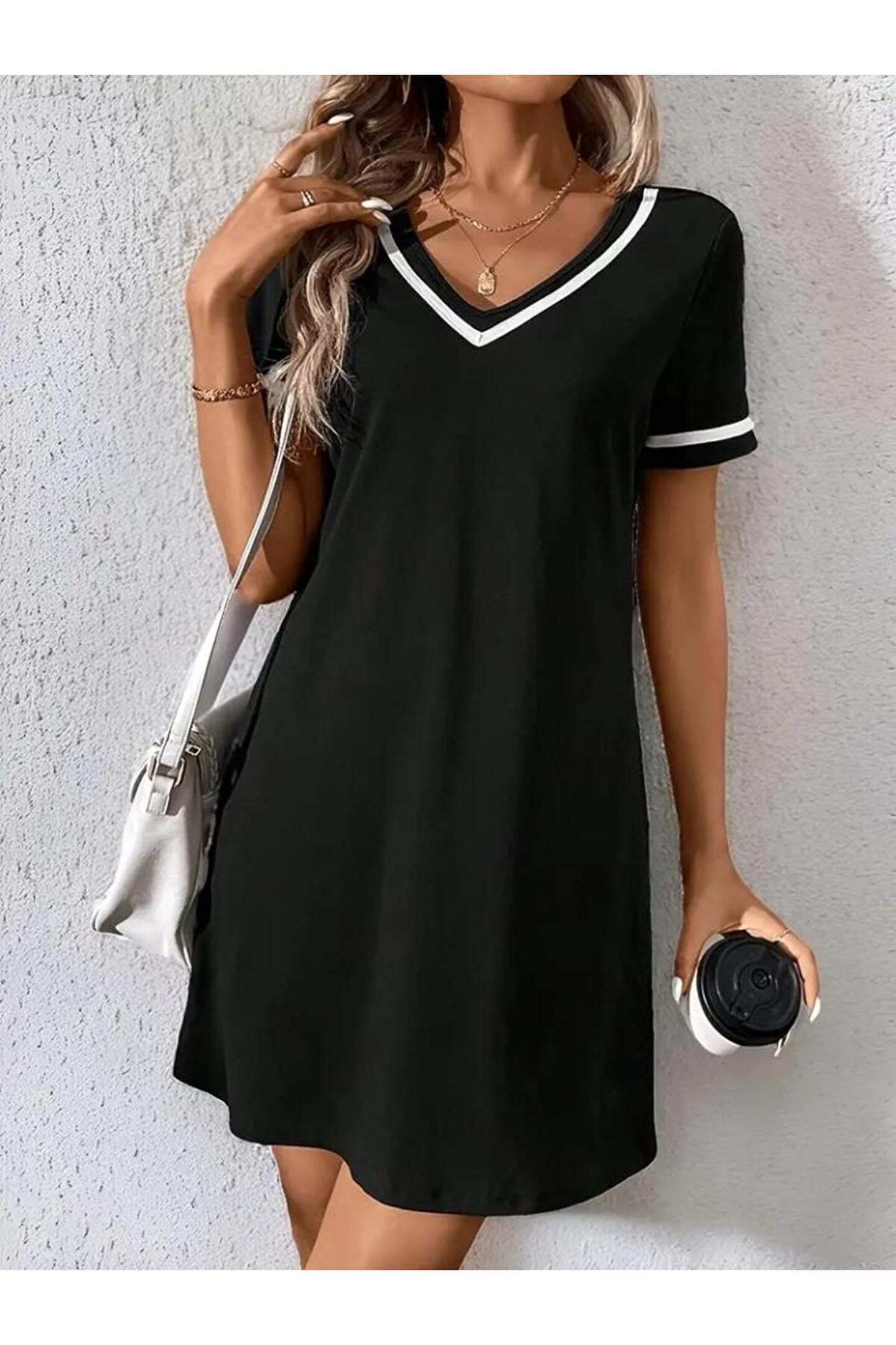 Kadın Kısa Kollu V çizgili Yakalı Kısa Viskon Elbise