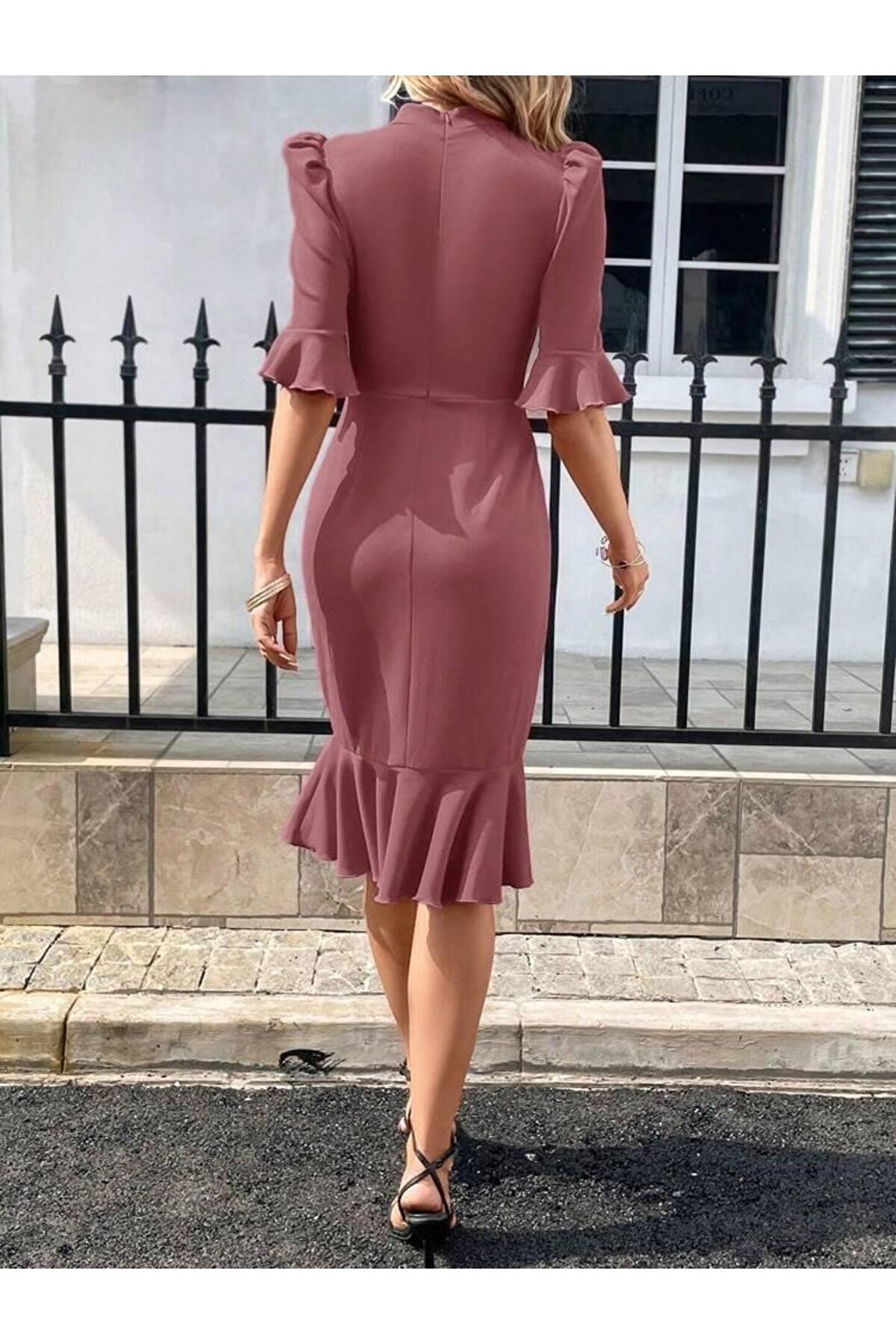 Kadın Kısa Kollu Yarı Balıkçı Yakalı Etek Ucu Fırfırlı Midi Ithal Krep Elbise