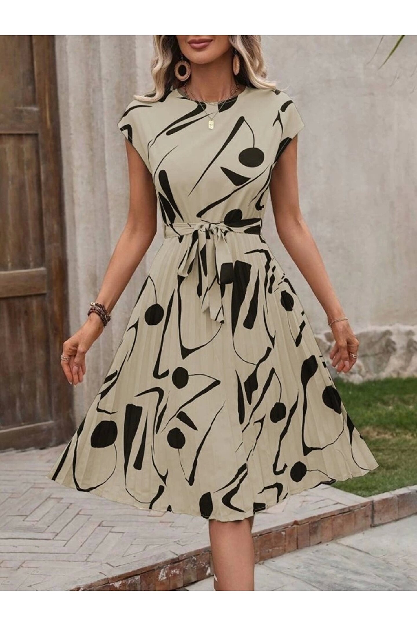 Kadın Kısa Yarasa Kollu Yuvarlak Yaka Beli Büzgülü Süprem Elbise