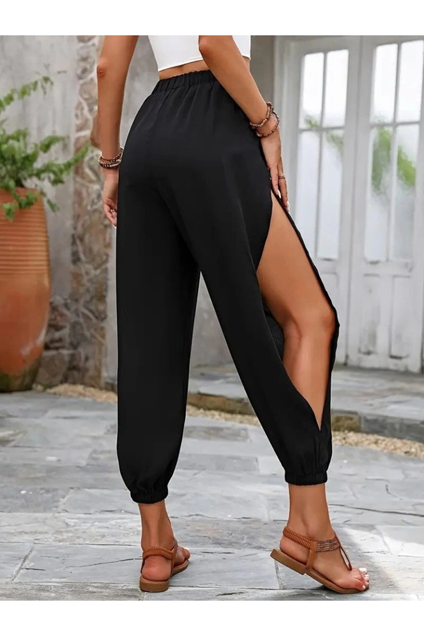 Kadın Yüksek Belli Yanlardan çapraz Detay Yırtmaçlı Viskon Pantolon