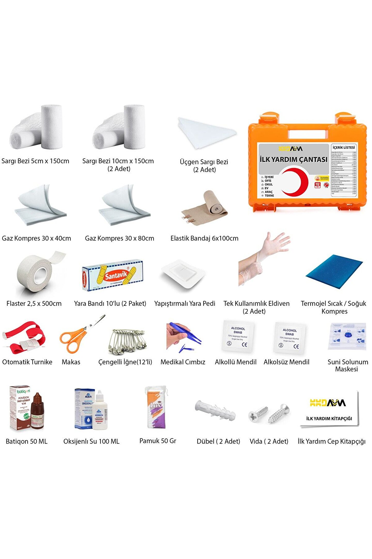 Ürün Özellikleri: Darbelere karşı dayanıklıdır.; ; Çantanın üstünde bulunan vida yuvaları sayesinde duvara monte edilebilir, harici bir aparat gerektirmez.; ; Çanta içerisinde iki adet bölme vardır.; Çanta açıldığında malzemelerin dağılmasını önlemek için bölmelerden bir tanesi pleksi ile kapatılmıştır.; ; Ürün Boyutları: En: 32 Cm ; Boy: 28 Cm ; Yükseklik: 13 Cm ; Ürün Paket İçeriği: Sargı Bezi 5x150 cm 1 Adet ; Sargı Bezi 10x150 cm 2 Adet ; Üçgen Sargı Bezi 2 Adet ; Steril Gaz Kompres 30x40 cm 1 Adet ; Steril Gaz Kompres 30x80 cm 1 Adet ; Elastik Bandaj 6x100 cm 1 Adet ; Flaster 2.5x500 cm 1 Adet ; Yara Bandı 20 Adet ; Yapışmalı Yara Pedi 1 Adet ; Hidrofil Pamuk 50 gr 1 Adet ; Tek Kullanımlık Eldiven 2 Adet ; Makas 1 Adet ; Çengelli İğne 12 Adet ; Termojel Sıcak/Soğuk Kompres 1 Adet ; Klipsli Turnike Lastiği 1 Adet ; Medikal Cımbız 1 Adet ; A.; Solüsyon 50 ml 1 Adet ; Oksijenli Su 100 ml 1 Adet ; Suni Solunum Maskesi 1 Adet ; Alkollü Mendil 1 Adet ; Alkolsüz Temizleme Mendili 1 Adet ; İlk Yardım Cep Kitabı 1 Adet ; Plastik Dübel 2 Adet ; Vida 2 Adet ;